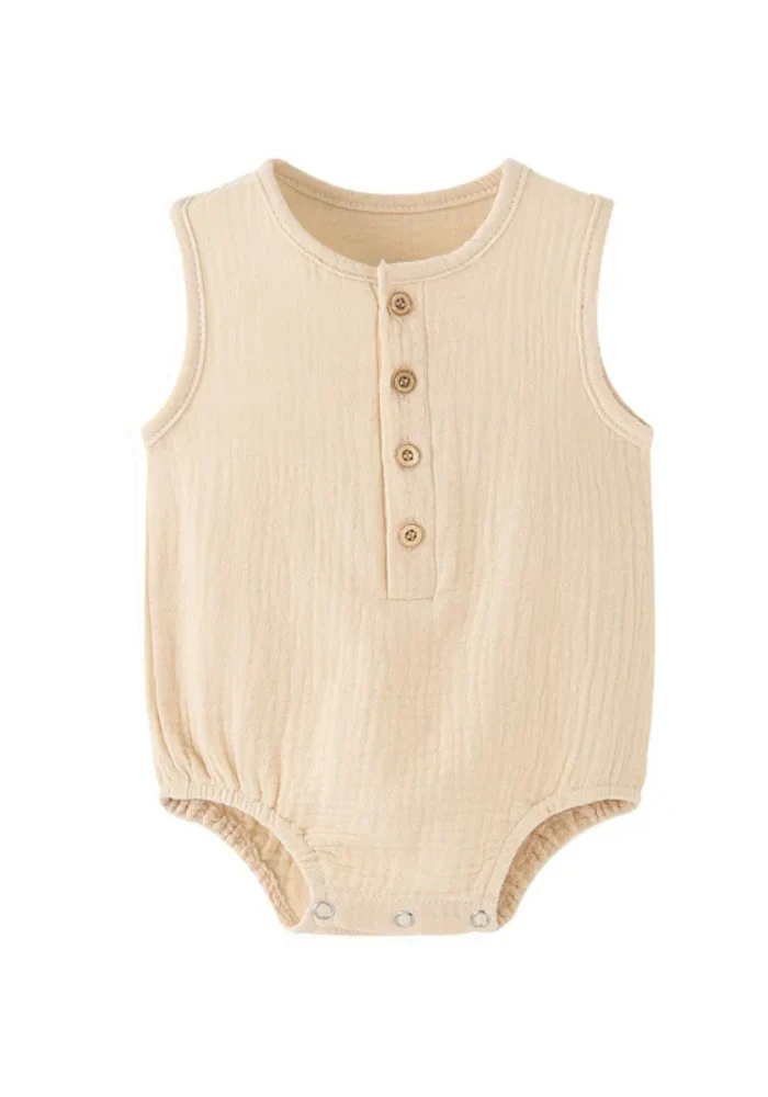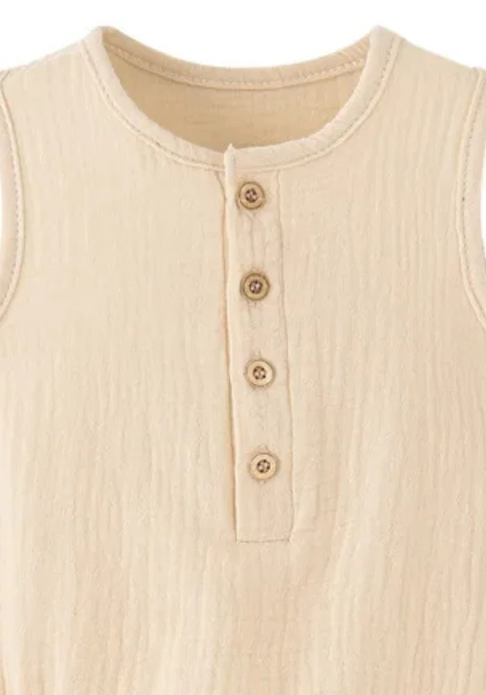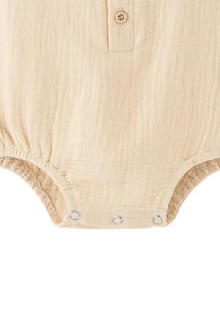 Plongez bébé dans un petit cocon de douceur avec notre charmant pyjama bébé pour l’été de couleur beige tout léger. Sa matière en gaze de coton laisse la peau respirer, pour des journées sans gêne même sous un soleil chaud. Les jolis boutons en bois ajoutent une touche nature, et les pressions à l’entrejambe facilitent le change. Un must-have pour une nuit simple et reposante.