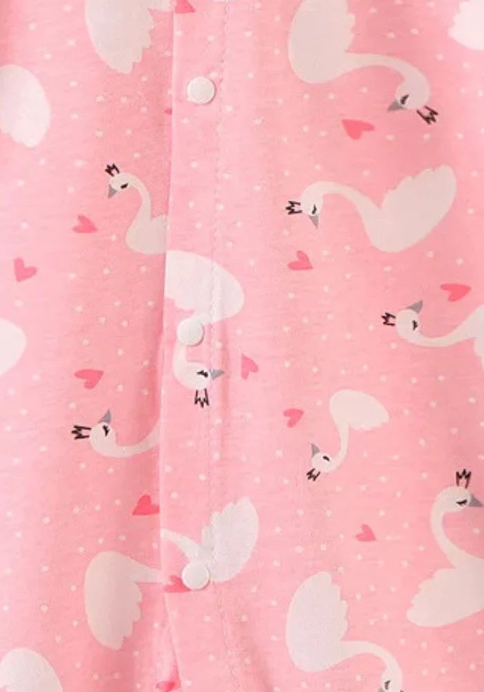 Offrez à bébé la grâce d’un ballet nocturne avec ces cygnes tout en élégance grâce à notre resplendissant pyjama bébé pour l’été imprimé cygne ! Sur un fond rose tendre, de jolis animaux blancs se dessinent. Confectionnée dans une maille respirante, cette tenue enveloppe votre enfant d’une douceur incomparable. Les boutons-pression bien pensés simplifient la routine du coucher.