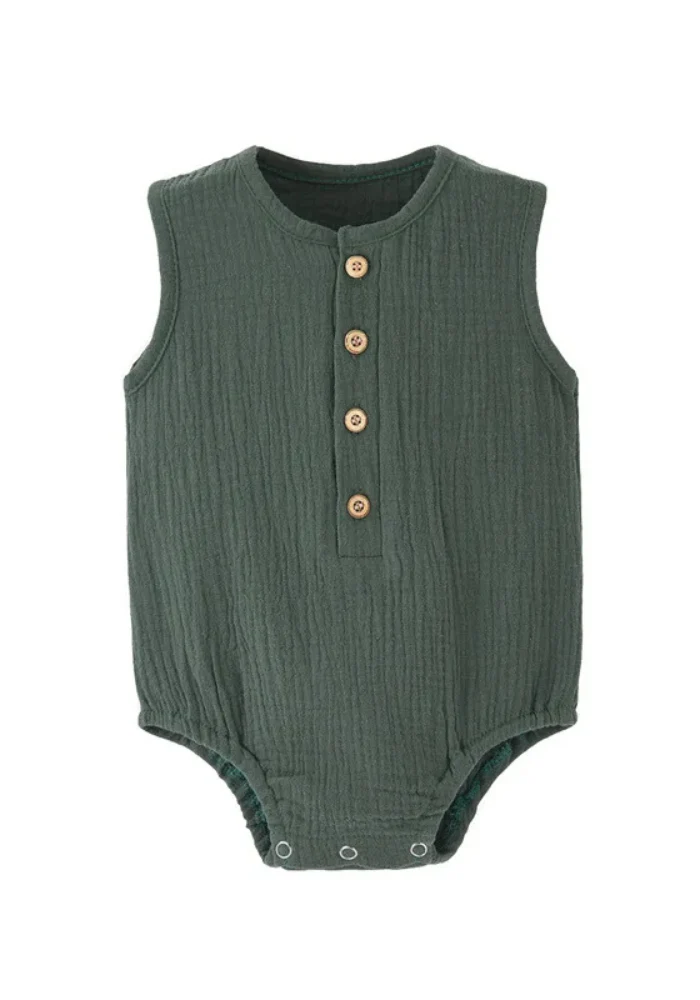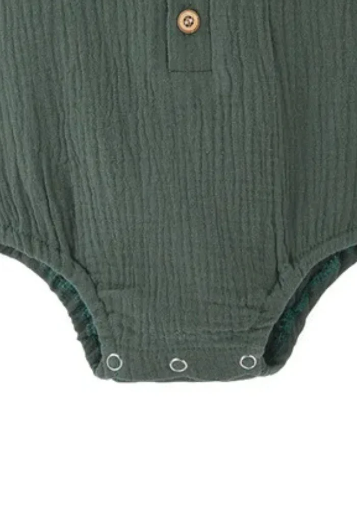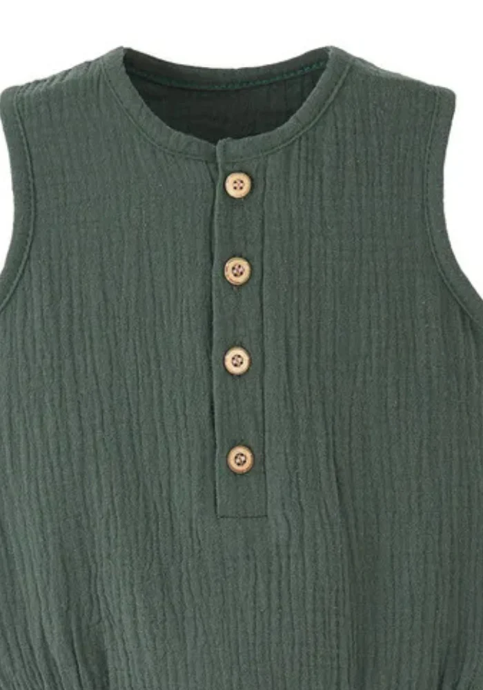 Laissez bébé explorer la nature dans ses rêves avec notre sublime pyjama bébé pour l’été de couleur olive, rappelant les forêts mystérieuses. Sa coupe sans manches garde votre tout-petit bien au frais, et la gaze de coton est hyper confortable au toucher. Les boutons de bois contrastent joliment avec le tissu, tandis que les pressions à l’entrejambe simplifient l’habillage. Un allié douillet pour toutes les nuits estivales.
