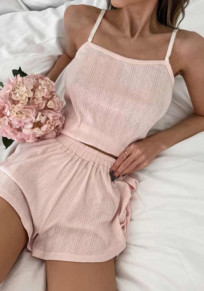 En n’importe quelle saison, portez notre magnifique pyjama avec short et top en coton pour femme ! Le combo parfait avec ce short ample et ce débardeur. Et quoi de mieux que cet agréable tissu en coton ? Tellement doux et respectueux de votre peau. La couleur rose ou gris bleu, se porte aussi bien en été qu’en hiver, pour vous permettre de faire de beaux rêves.
