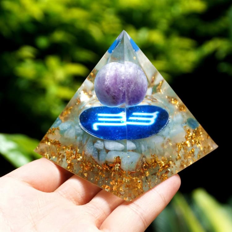 Pyramide du Zodiac en Orgonite et Améthyste de 10cm symbole du Scorpion