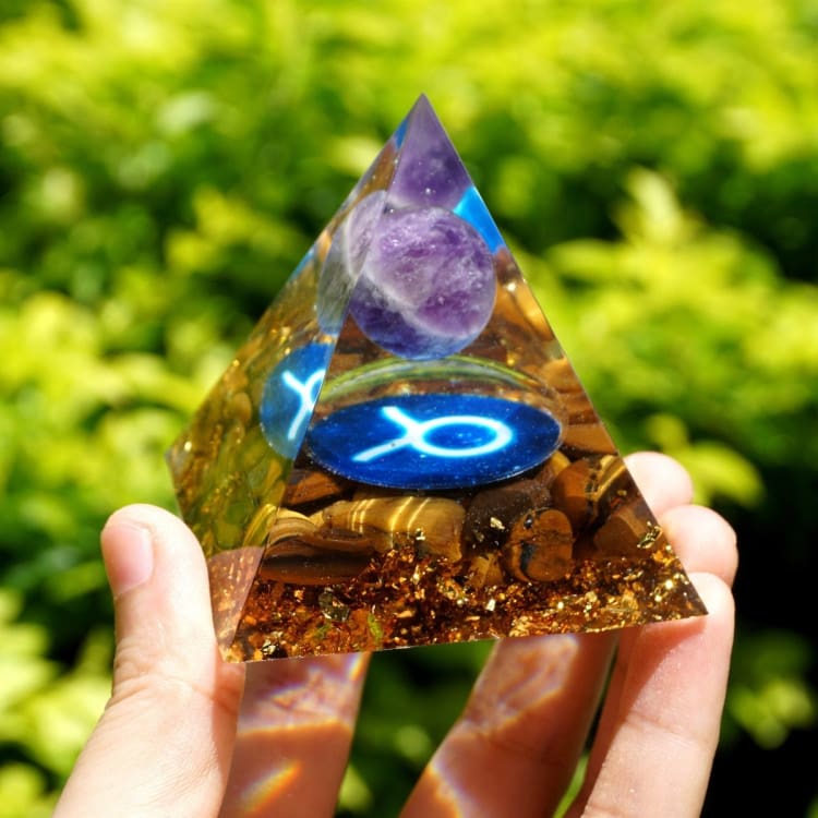 Pyramide du Zodiac en Orgonite et Oeil de Tigre de 10cm symbole du Taureau