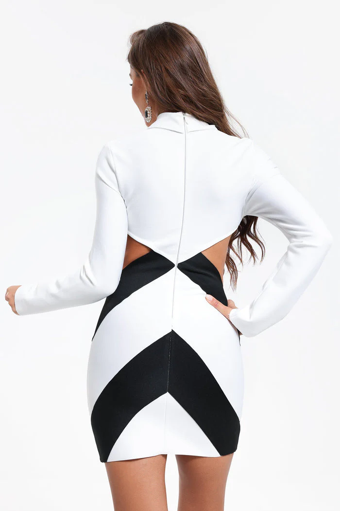 Robe bicolore courte Avec cravate Col revers Taille découpée Manches longues
