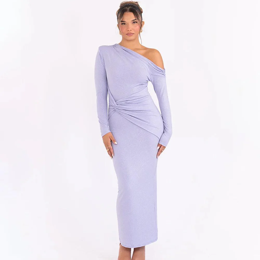 Robe longue pailletée Manches longues Une épaule dénudée Drapée Moulante