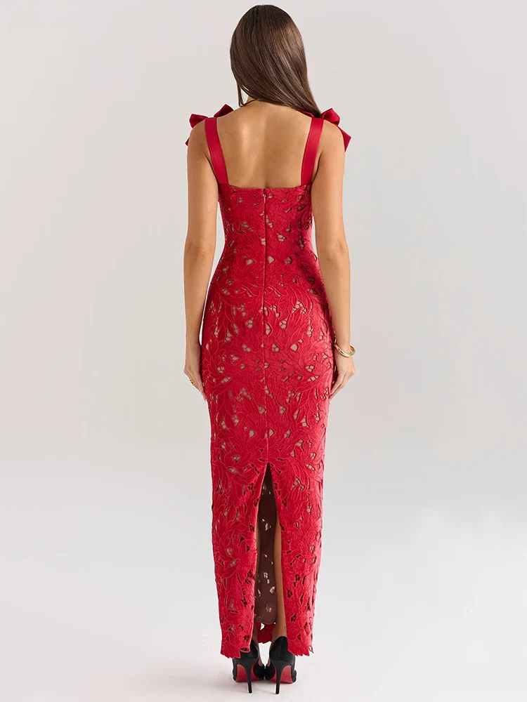 ROBE DE SOIRÉE LONGUE EN DENTELLE À BRETELLES NOUÉES