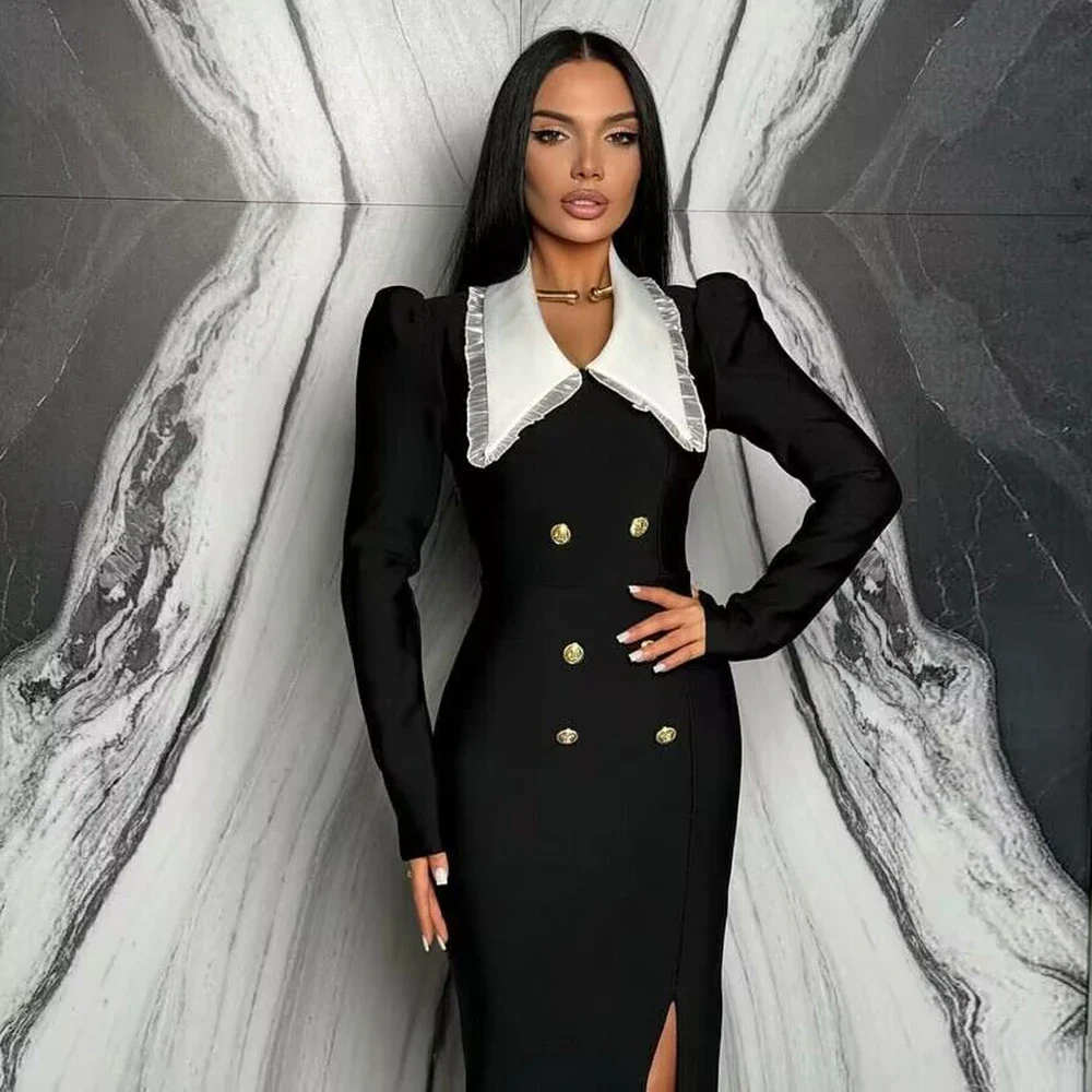 Livraison rapide disponible (1semaine) Robe longue Fente latéral Col Claudine Épaulette bouffantes Manches longues Boutons décoratifs Coupe droite Légèrement extensible