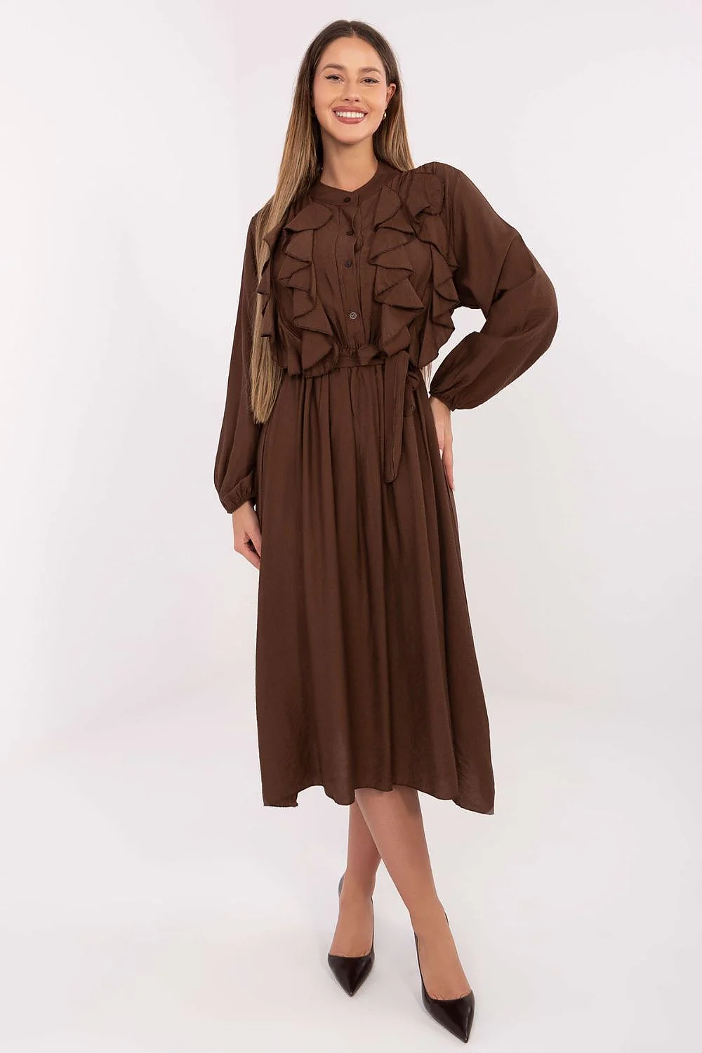 Robe mi-longue Manches bouffantes longues Col montant Boutonné et à volants Ceinture à nouer Taille Longueur Tour de hanche Tour de poitrine Tour de taille unique 121 cm 136 cm 104 cm 62-130 cm