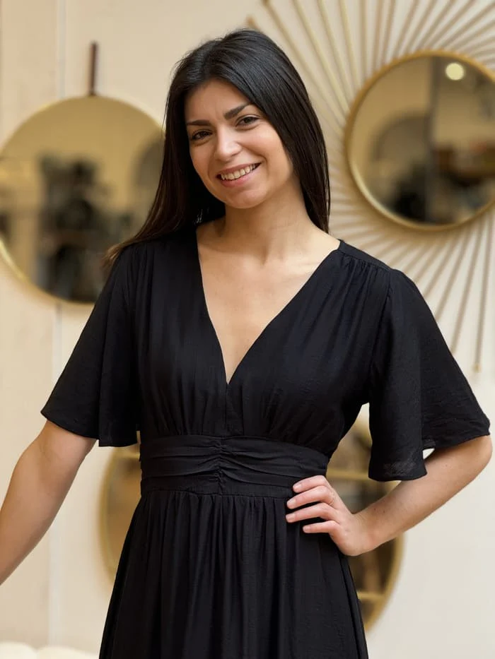 ROBE LONGUE À MC Cintrée sous poitrine Justine mesure 1m69 et Mathilde mesure 1m65. Elles portent la taille S/M pour ce modèle. Margaux mesure 1m68. Elle porte la taille 2XL (44) pour ce modèle. Taille : SM (36-38) / ML (38-40) Grande taille : L (40) XL (42) 2XL (44) 3XL (46) 4XL (48) Composition […]