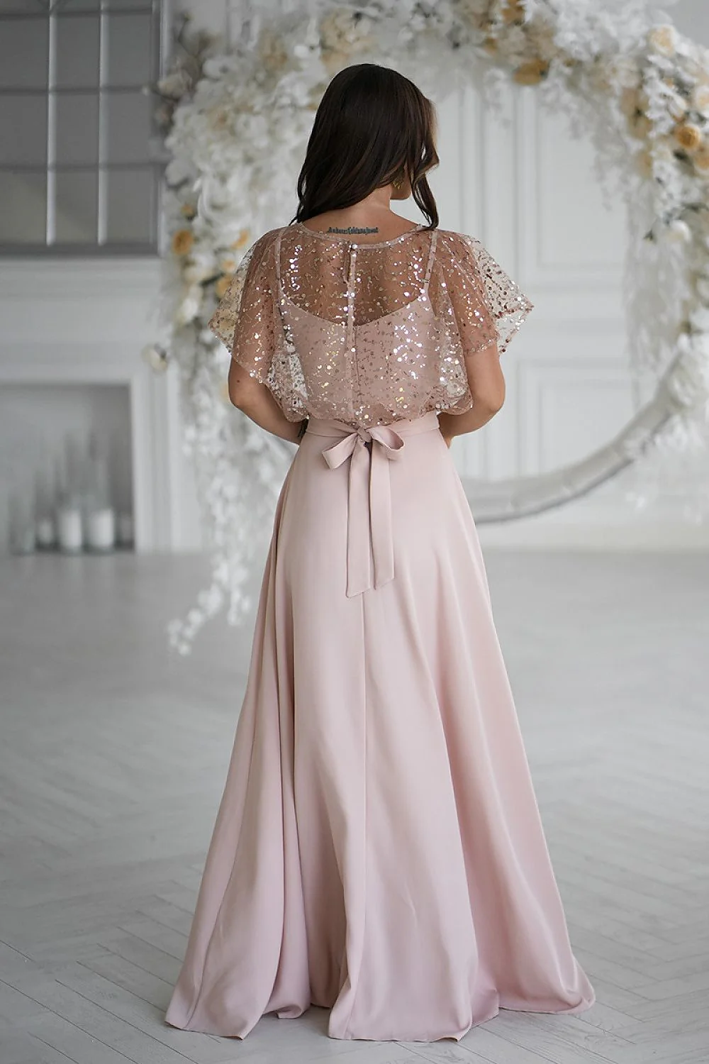 ROBE LONGUE AVEC CAPE TRANSPARENT À SEQUINS