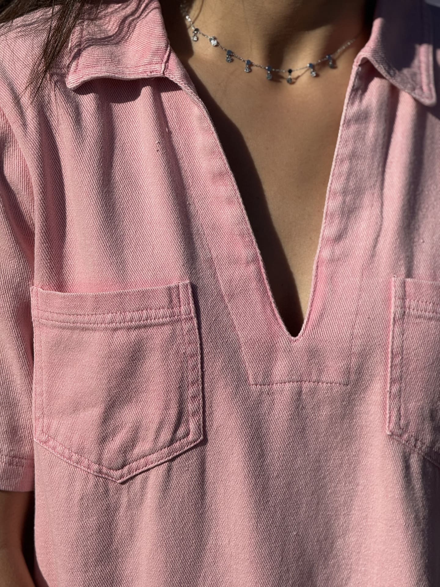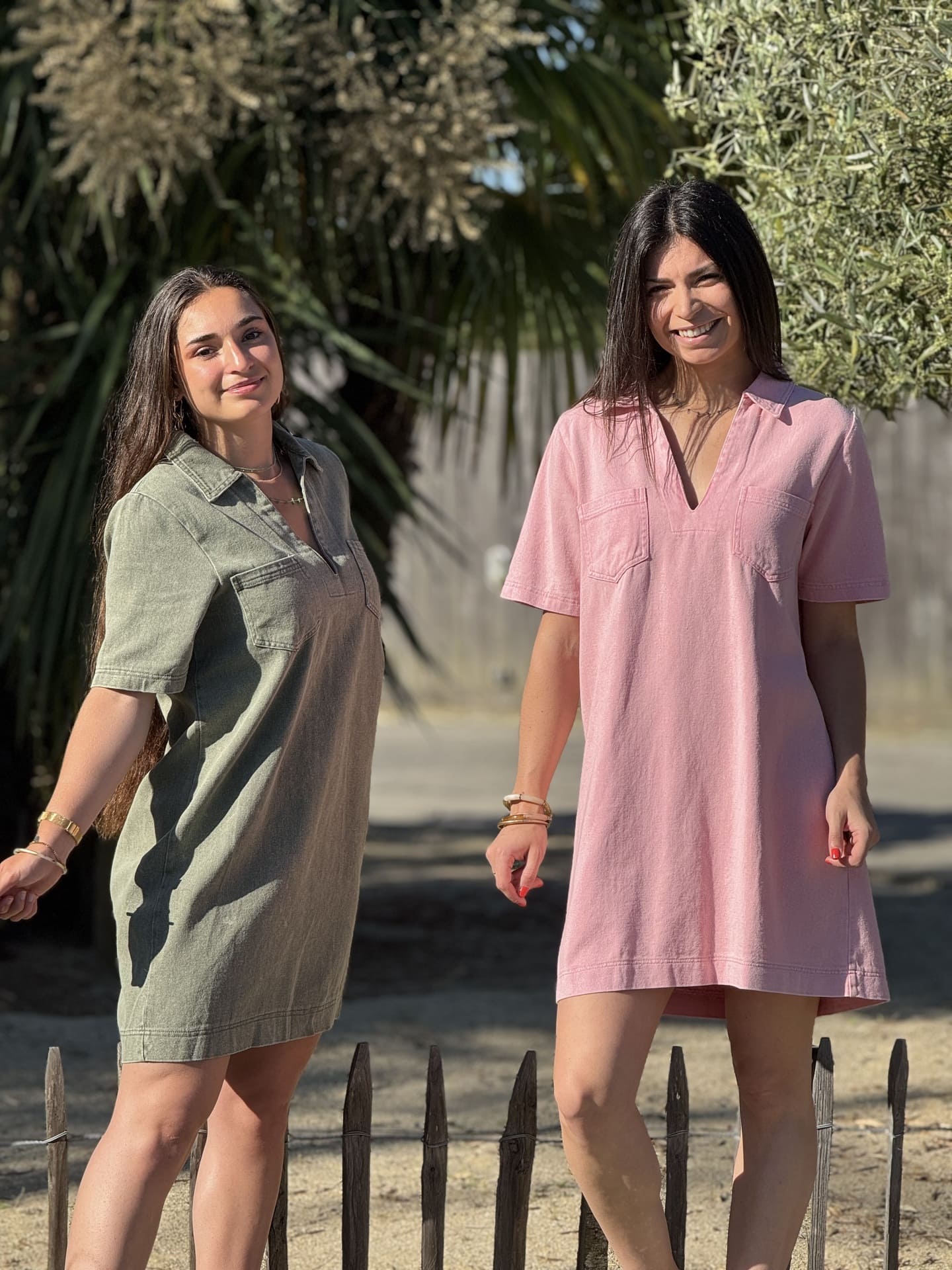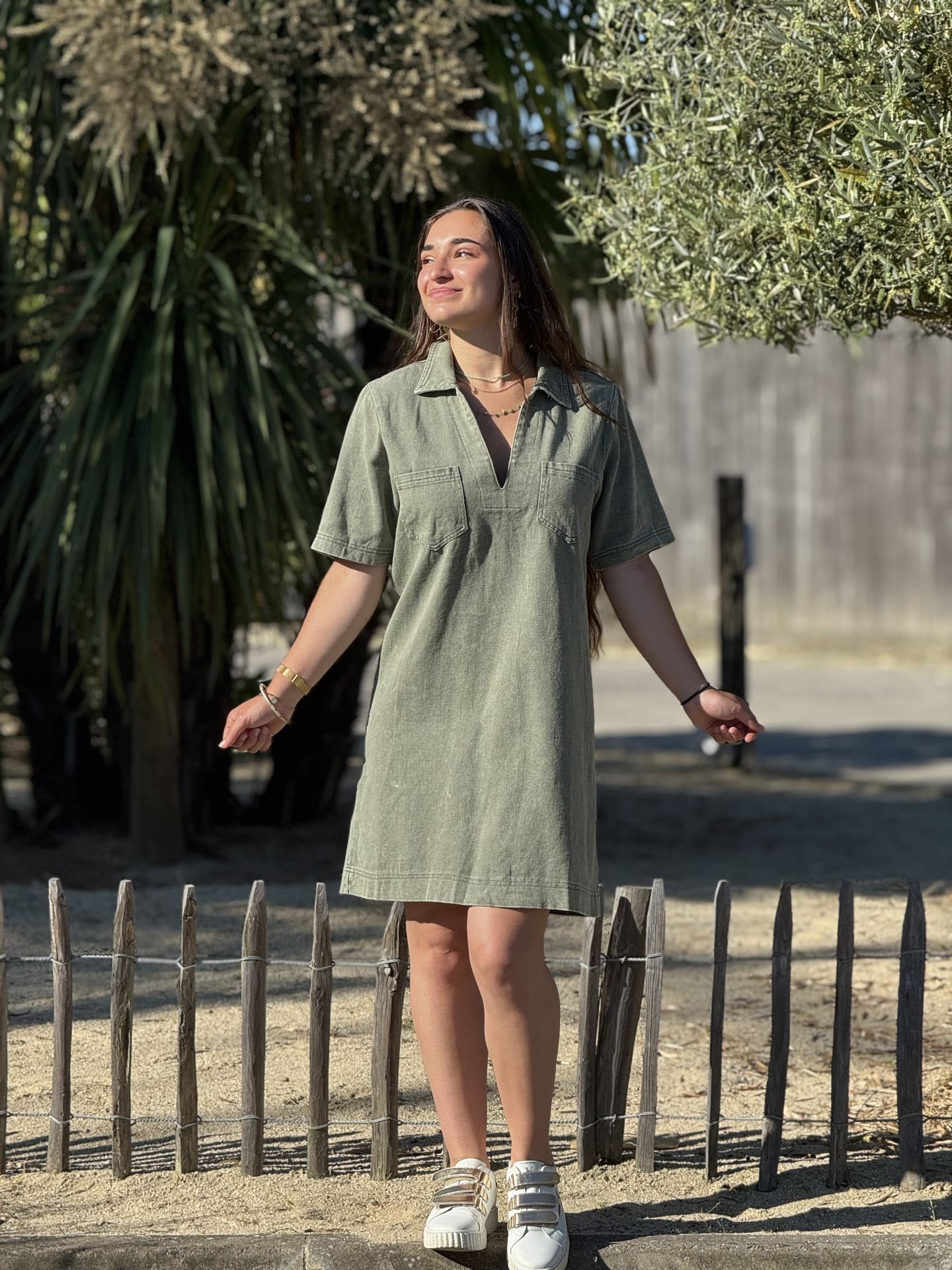 - ROBE COURTE EN JEAN 2 poches poitrine à mc col v