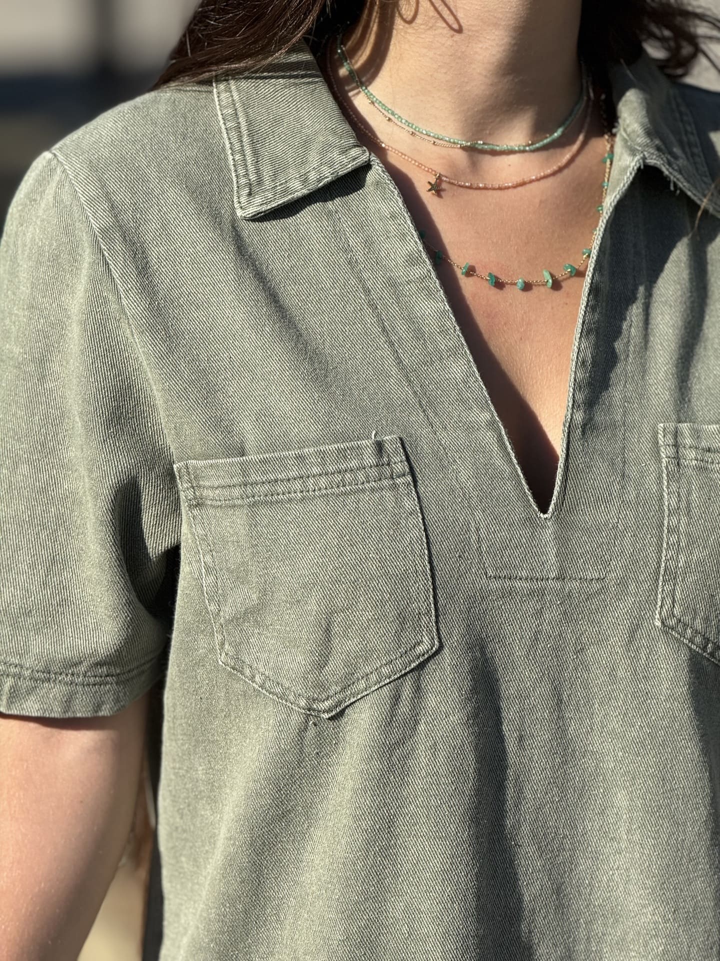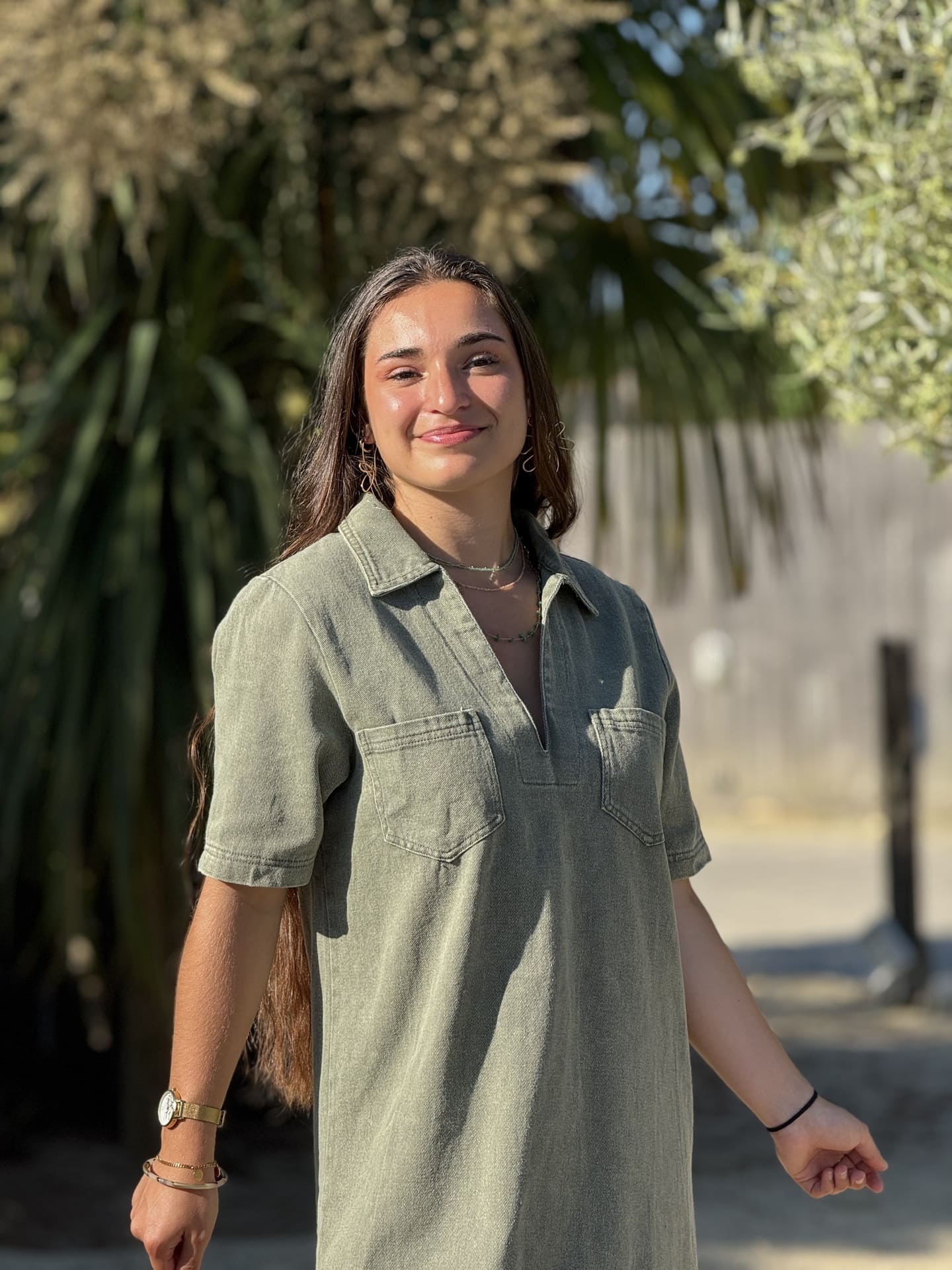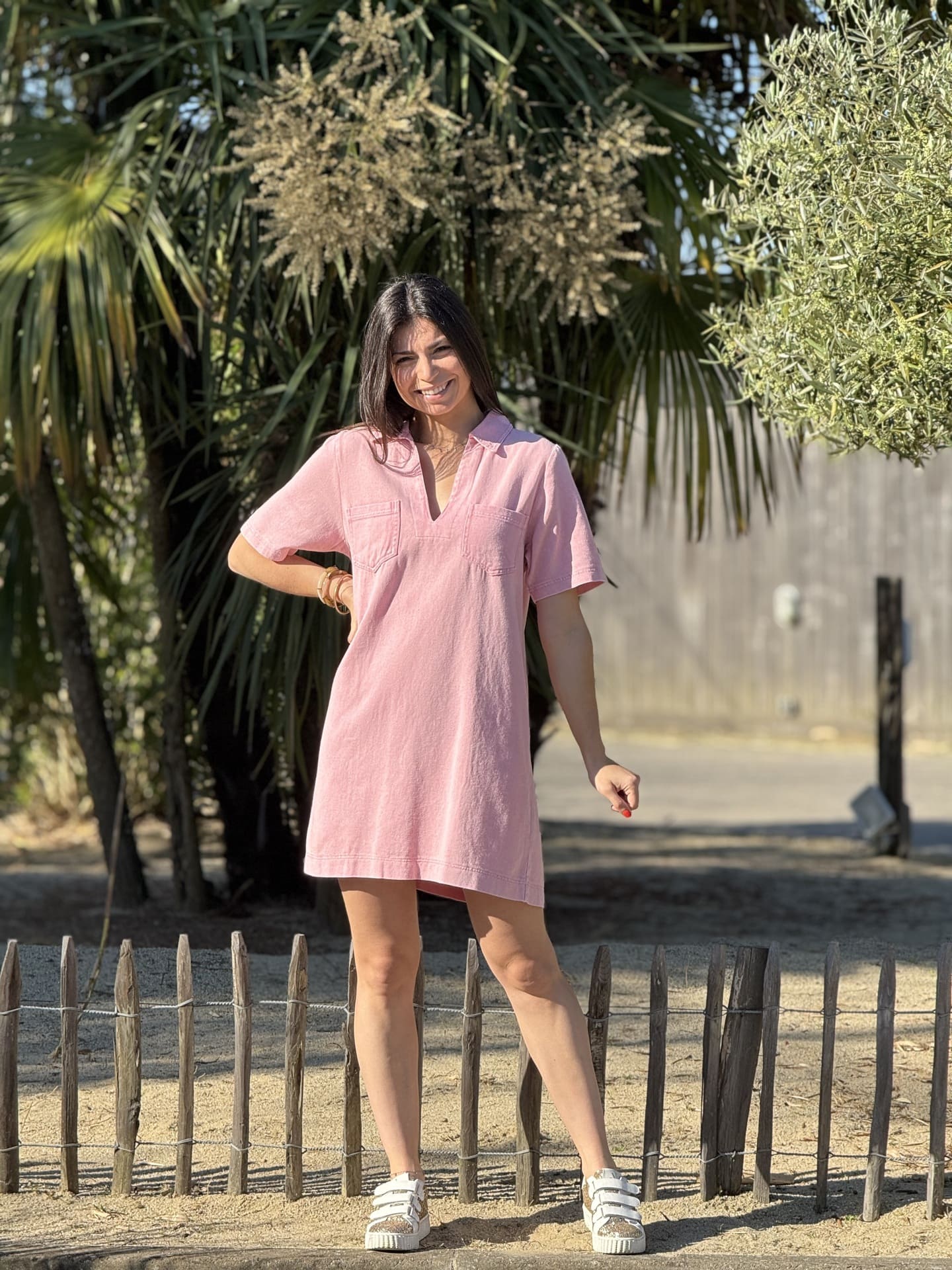 - ROBE COURTE EN JEAN 2 poches poitrine à mc col v
