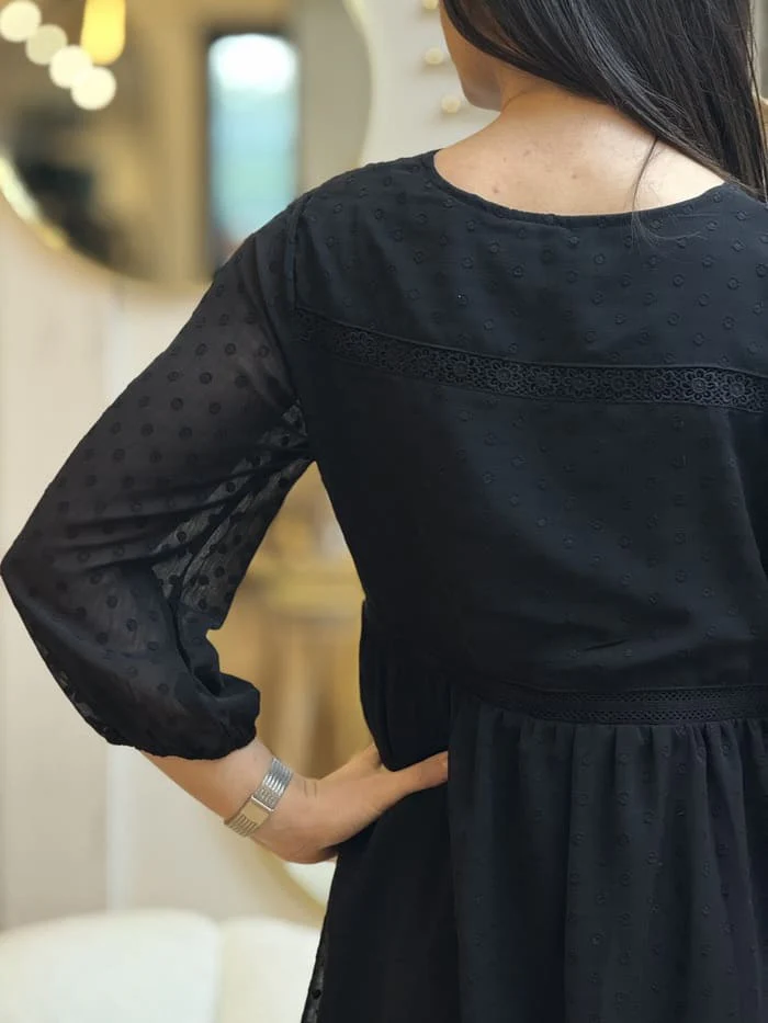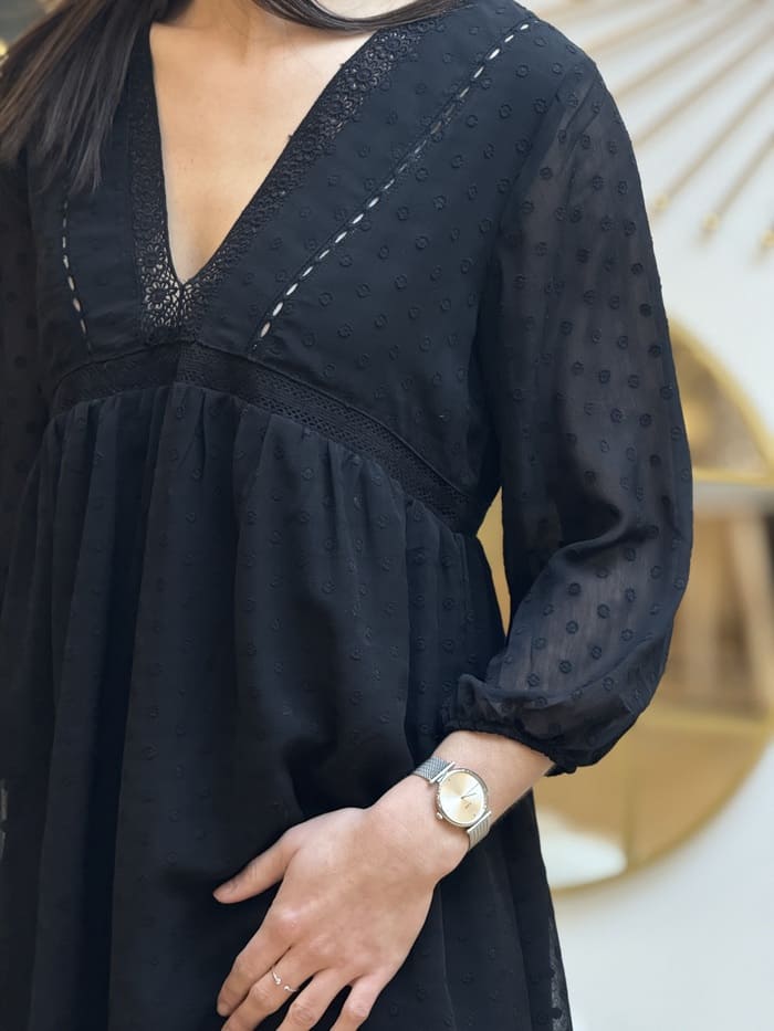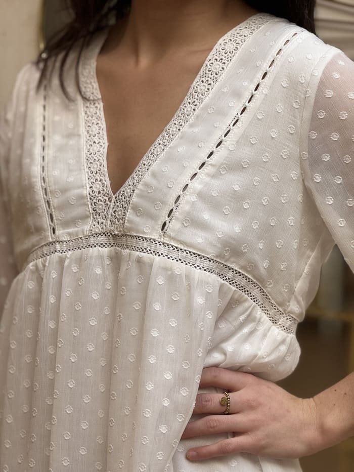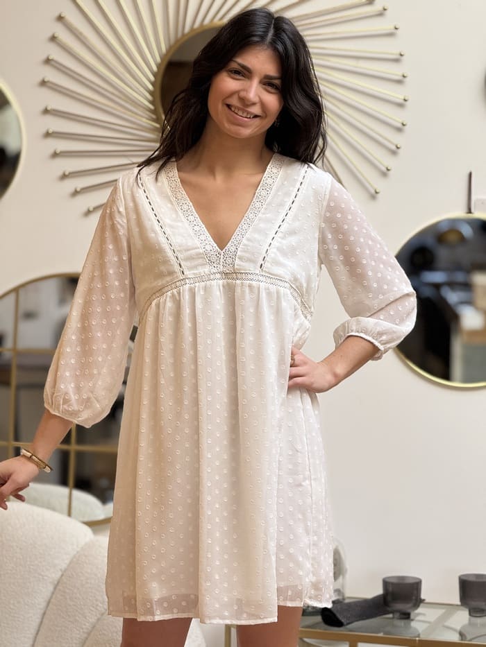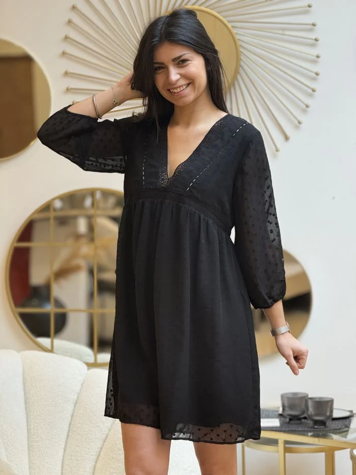 Robe babydoll col v plumetis Taille : Justine mesure 1m69. Elle porte la taille S/M pour ce modèle. Taille : S/M (36-38) et M/L (38-40) Composition & entretien : 70% VISCOSE 30% POLYESTER Lavage à la main conseillé Besoin d’un conseil ? Consultez notre foire aux questions ou contactez-nous via notre formulaire de contact