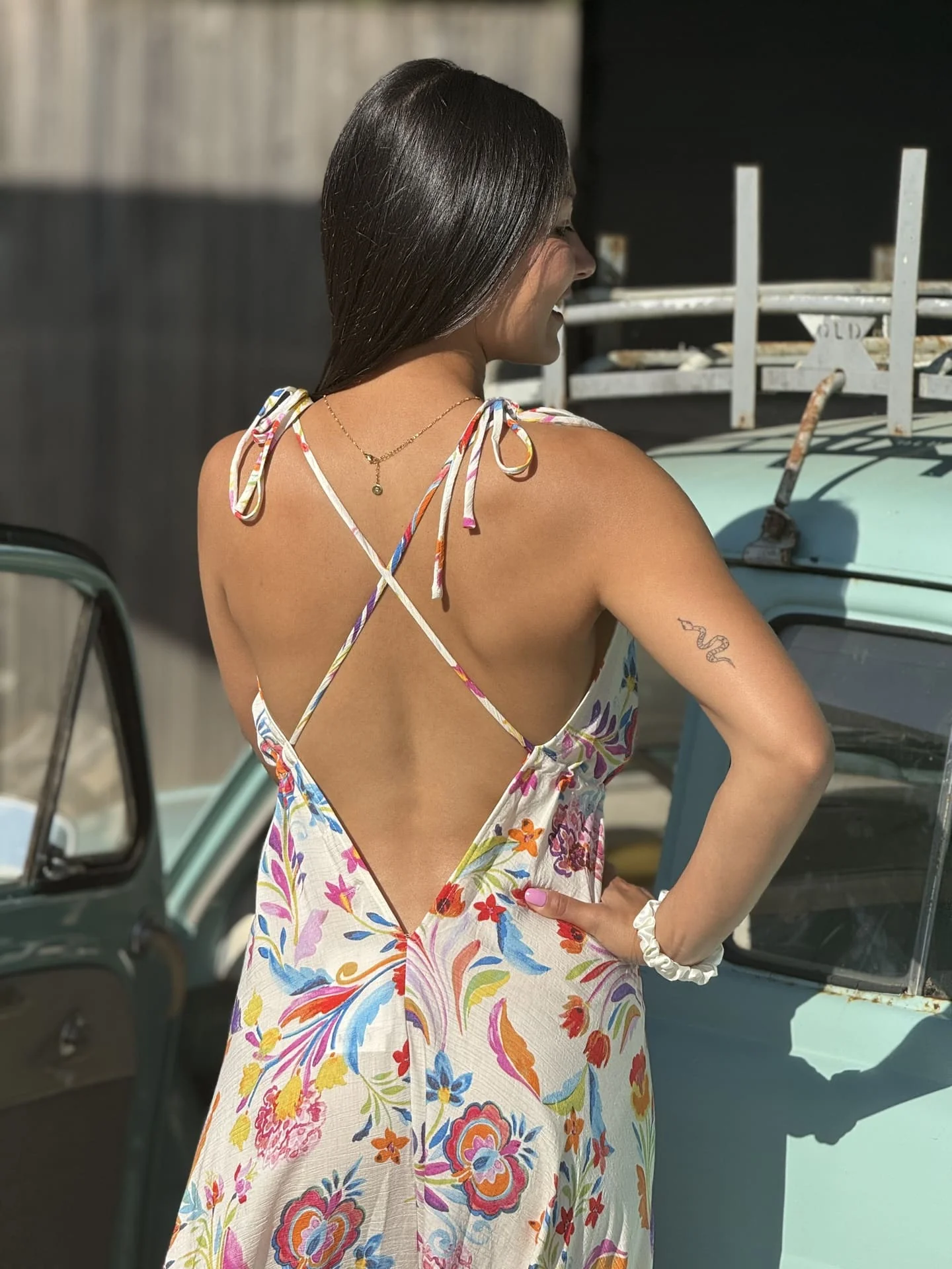 - Robe longue à bretelles col v imprimé fleuris coloré