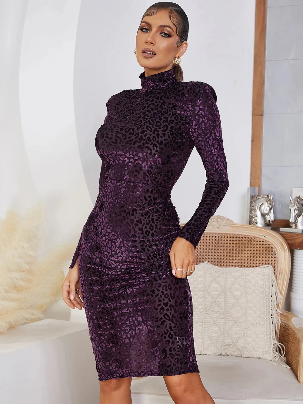 Robe velours Mi-longue Avec manches Motif léopard Moulante Col roulé À épaulettes Fente & fermeture éclair arrière
