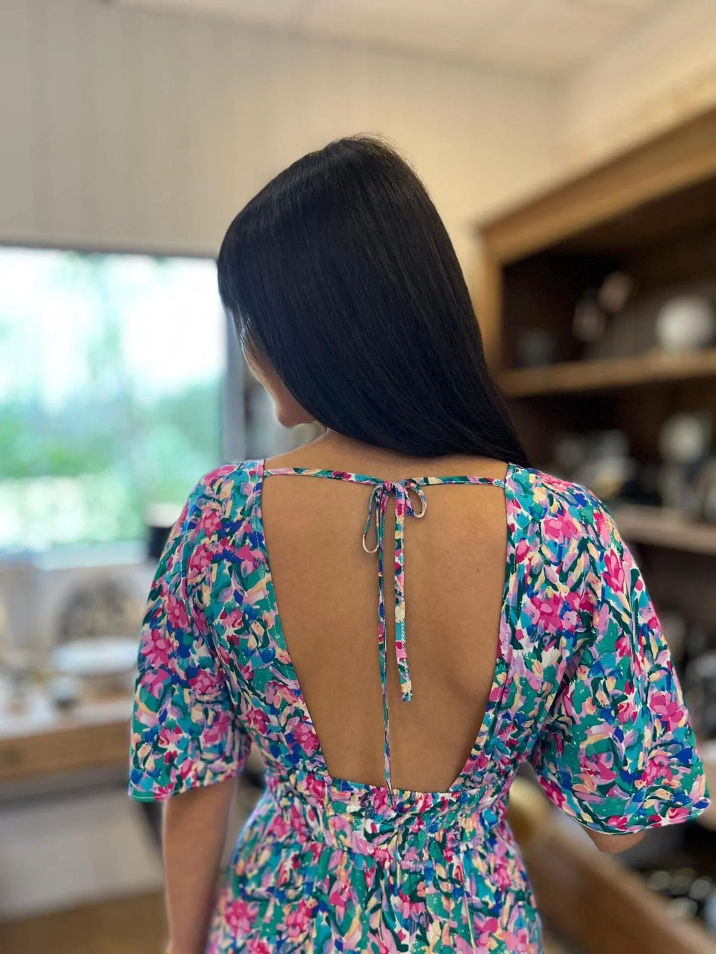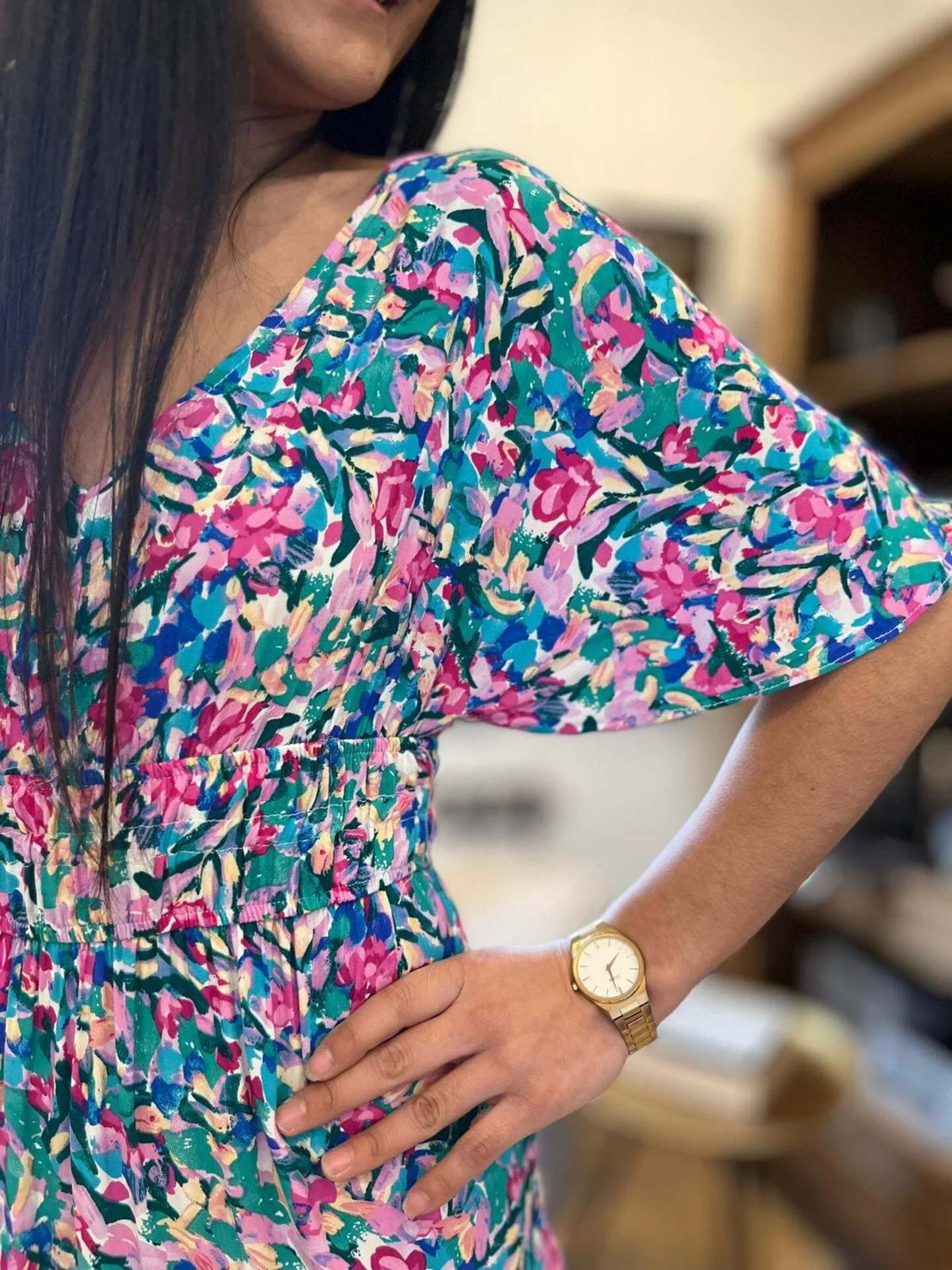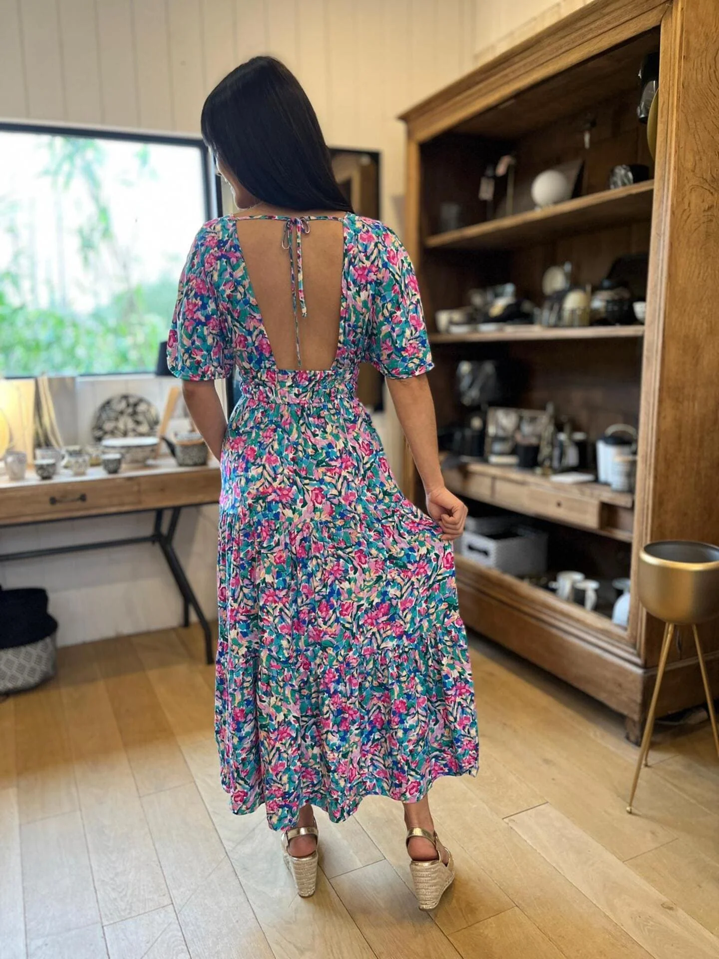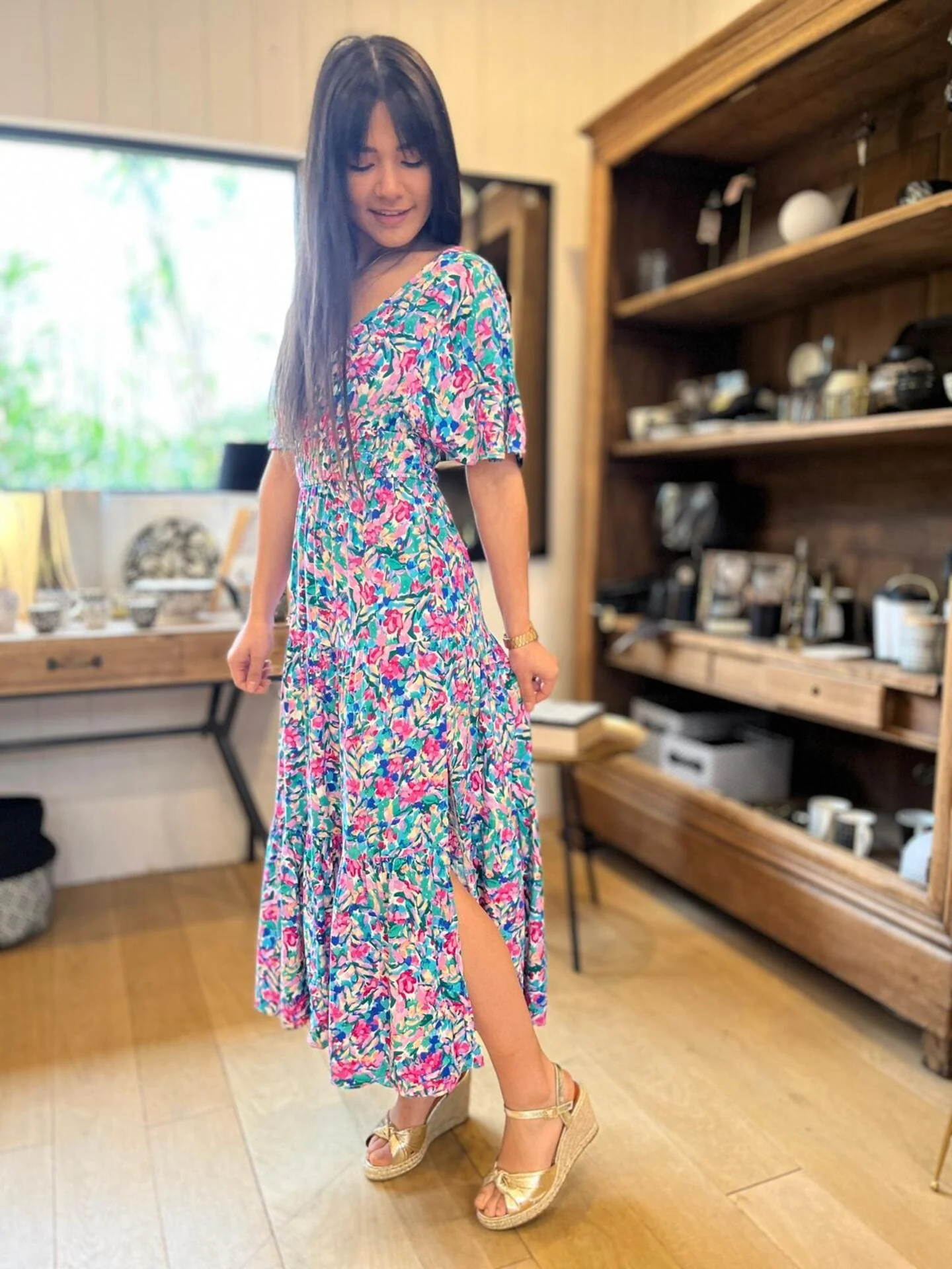 - Robe longue à mc col v resserré à la taille – imprimé fleuris multicolore