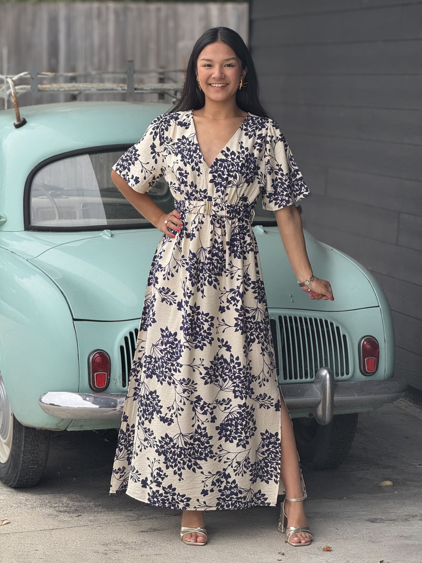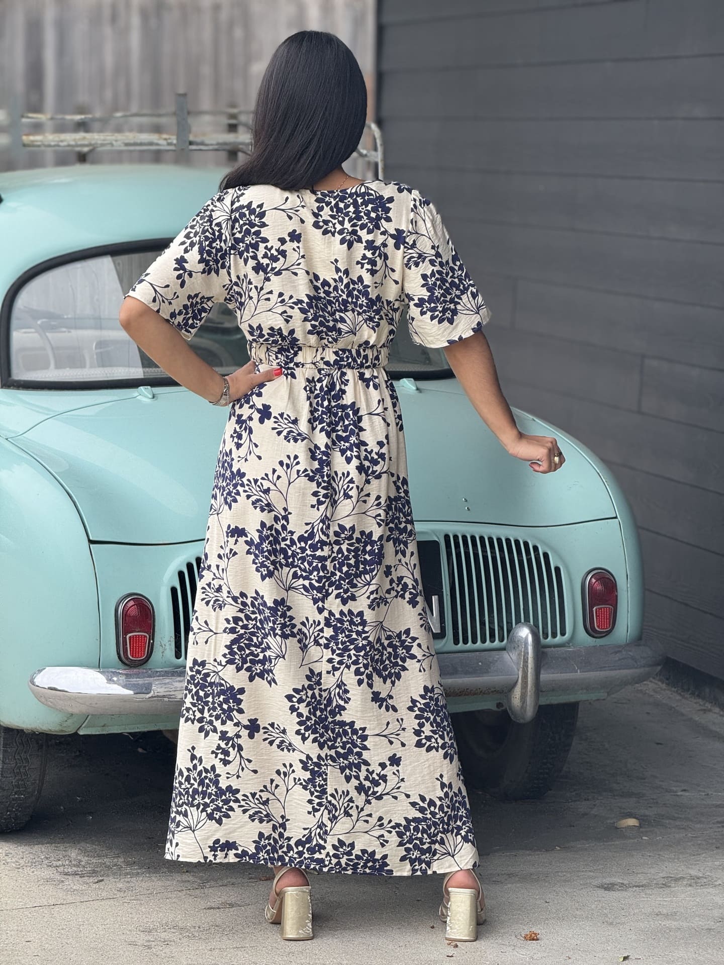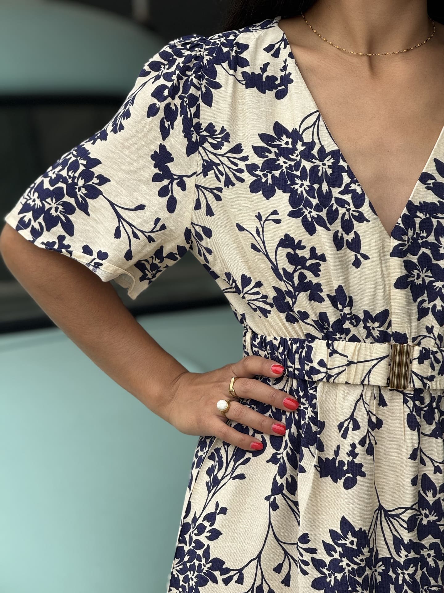 - ROBE LONGUE à mc col v – imprimé feuilles bleu