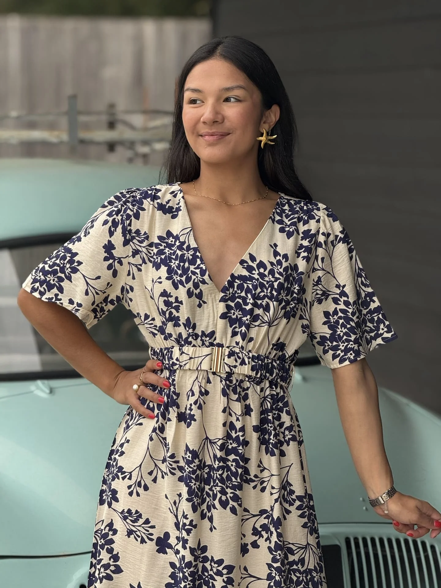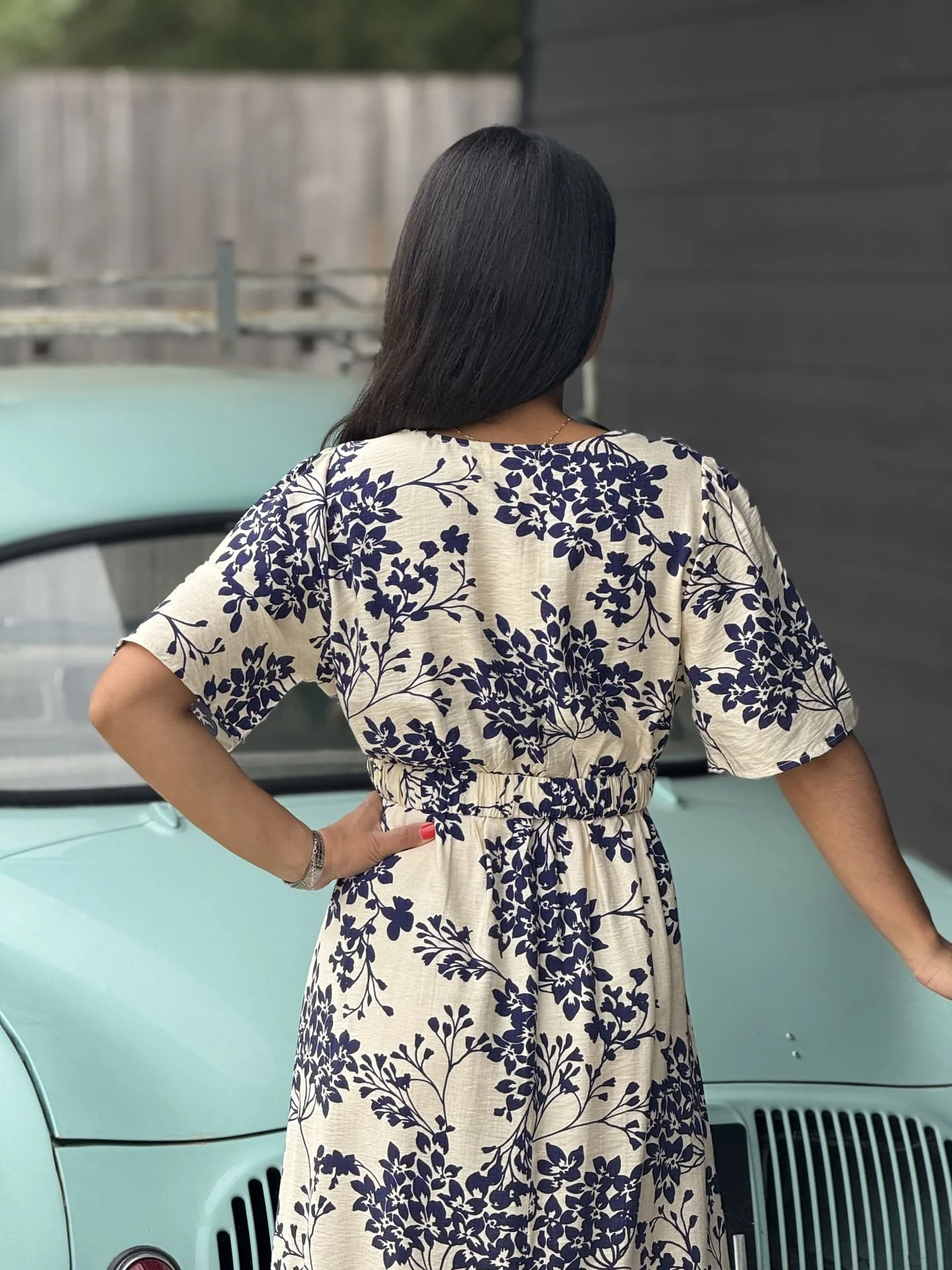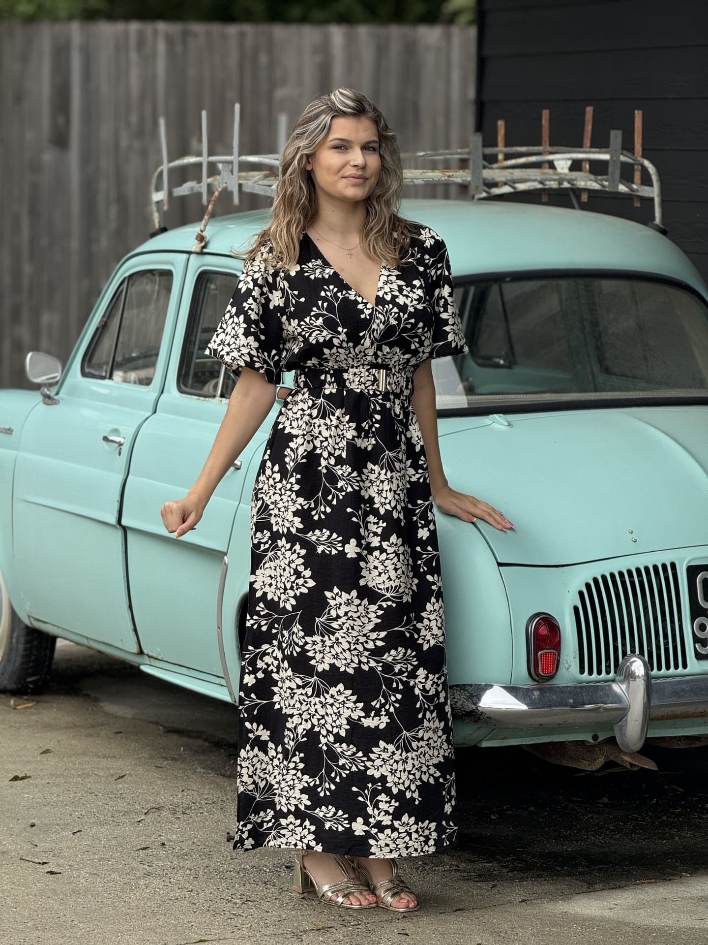 - ROBE LONGUE à mc col v – imprimé feuilles bleu