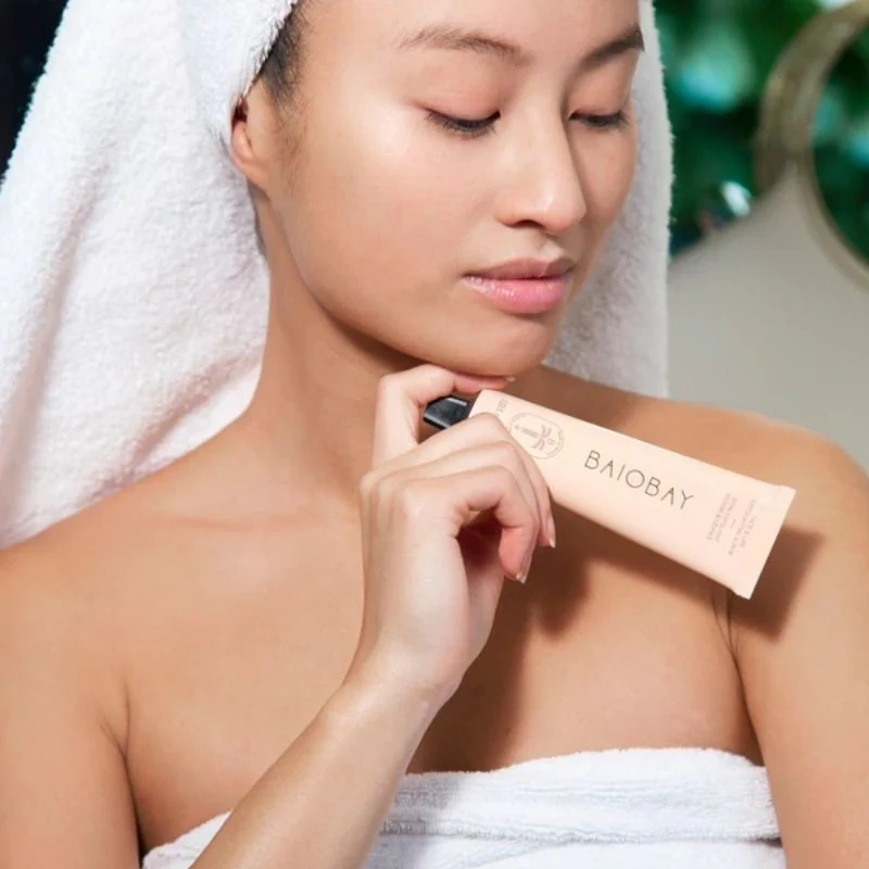 Sur peau humide, appliquer le Soin Exfoliant Visage & Lèvres BAIOBAY puis exfolier en massant.