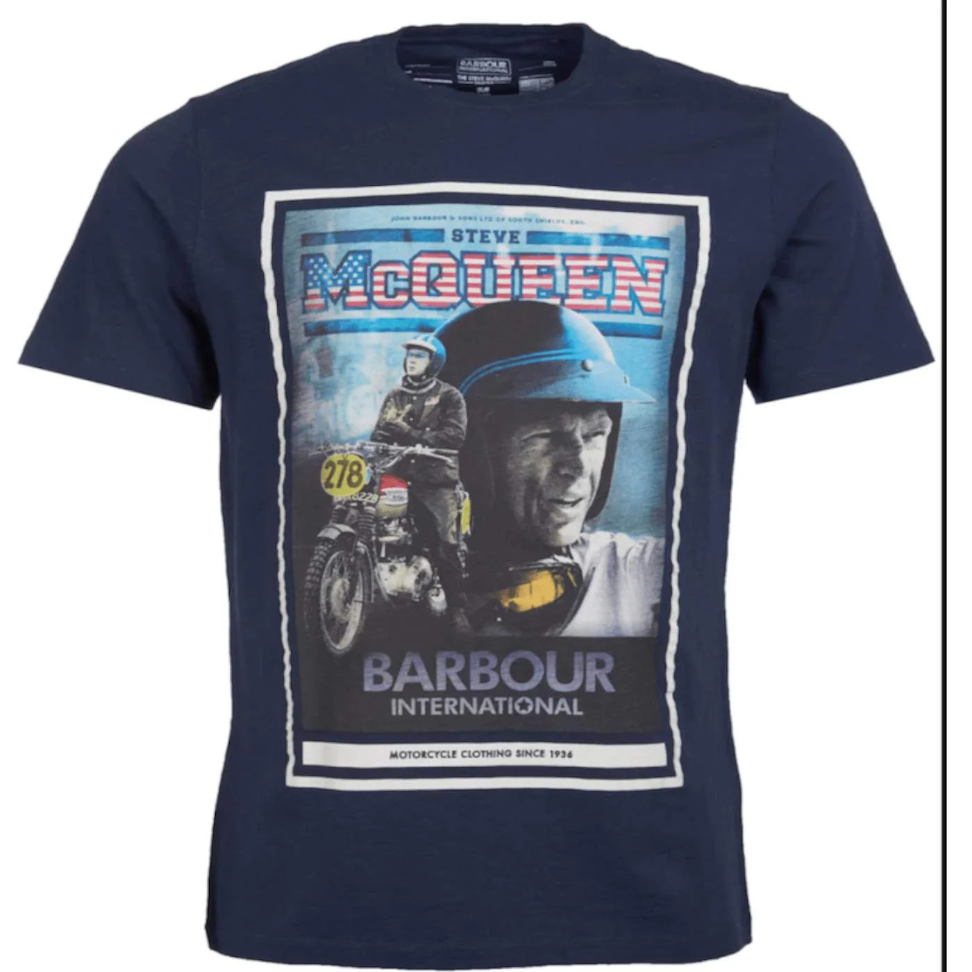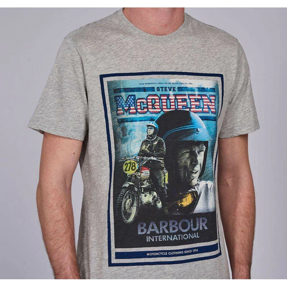 Fabriqué dans un doux jersey de coton pour l’aspect et le toucher d’un vintage, ce tee-shirt célèbre l’histoire de Steve McQueen et de Barbour International avec une impression photographique en couleur sur la poitrine.