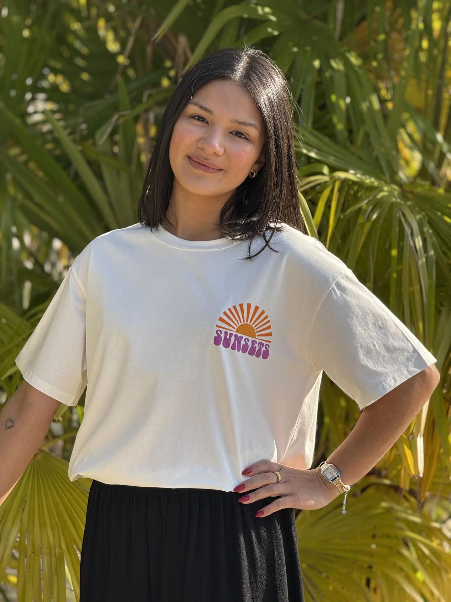 T-shirt à mc col rond inscription sunsets Taille : Mathilde mesure 1m68. Elle porte la taille S/M pour ce modèle. Taille : S/M (36-38) et M/L (38-40) Composition & entretien : 100% COTON Lavage à la main conseillé Besoin d’un conseil ? Consultez notre foire aux questions ou contactez-nous via notre formulaire de contact