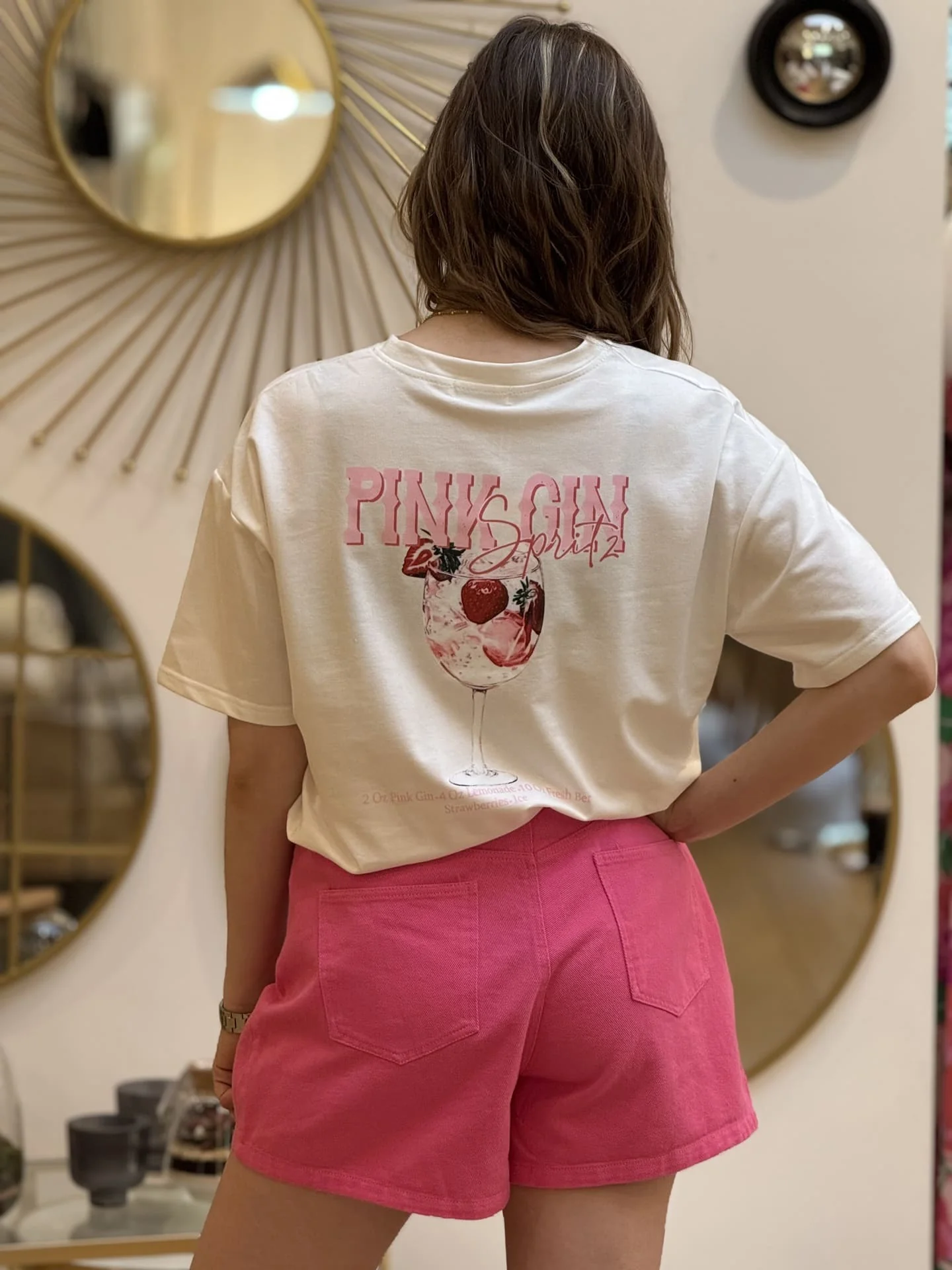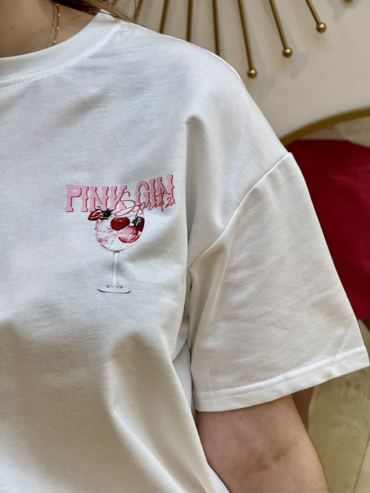 - T-SHIRT A MC COL ROND LOOSE IMPRIME PINK GIN + VERRE COCKTAIL