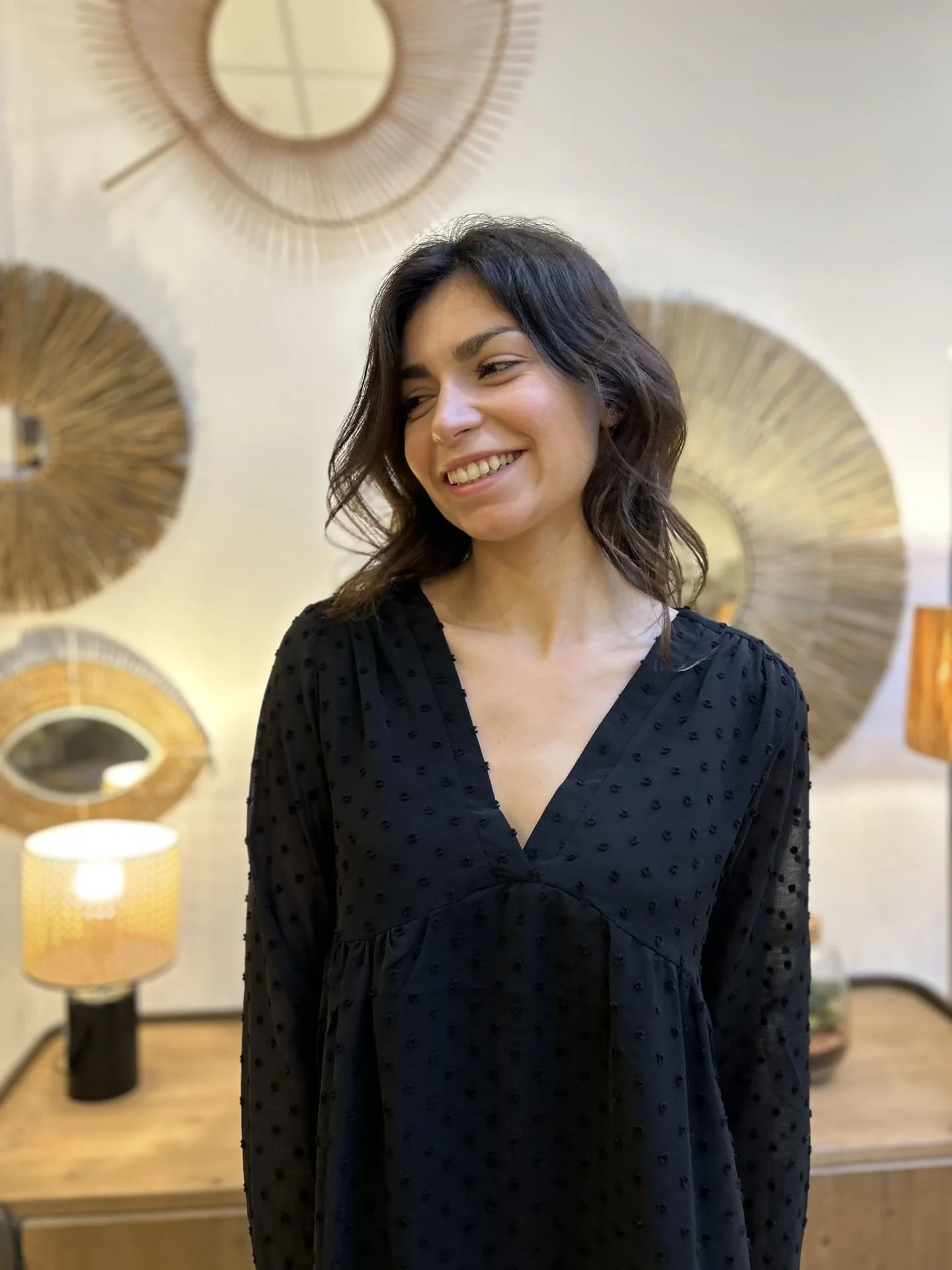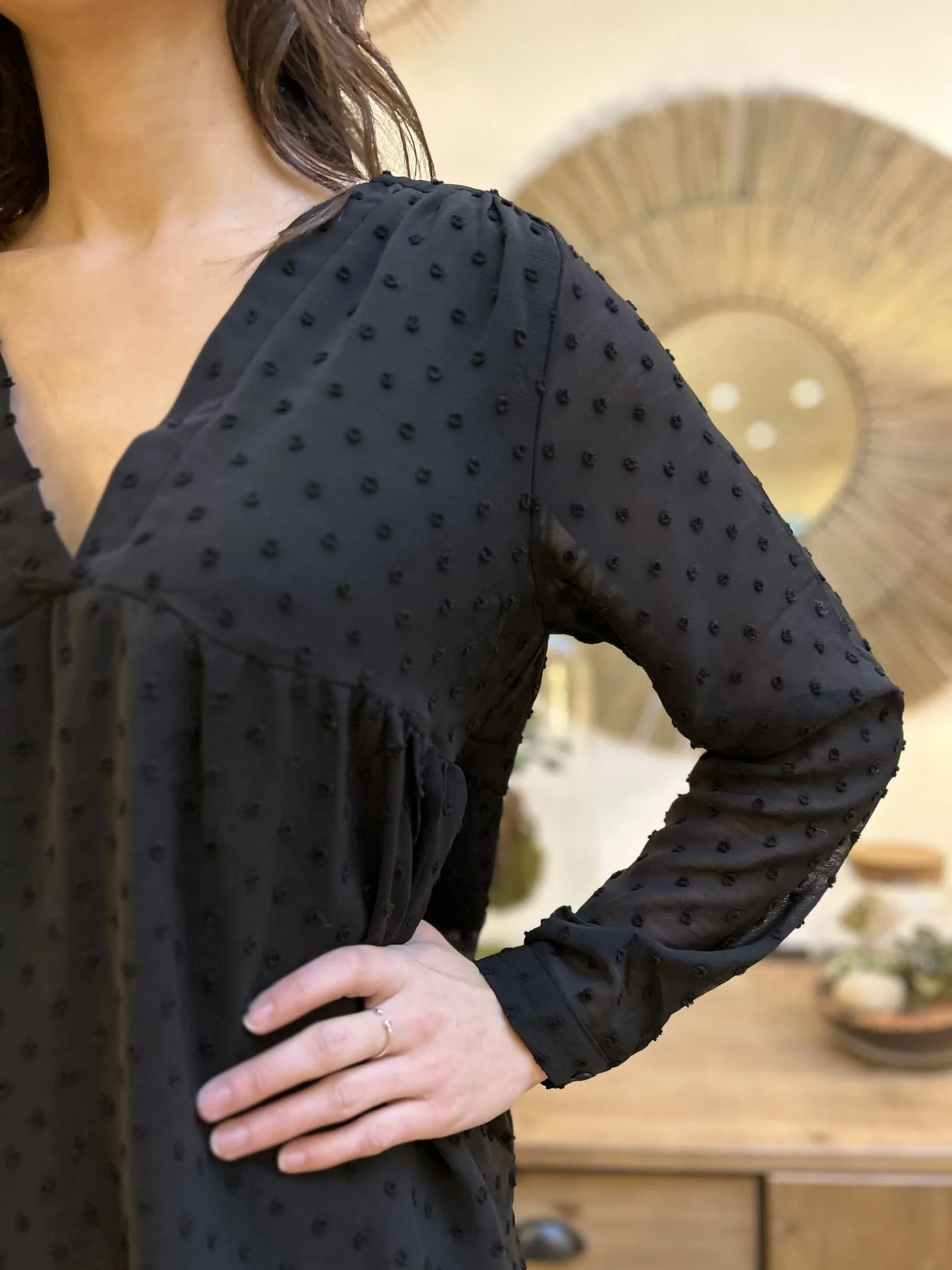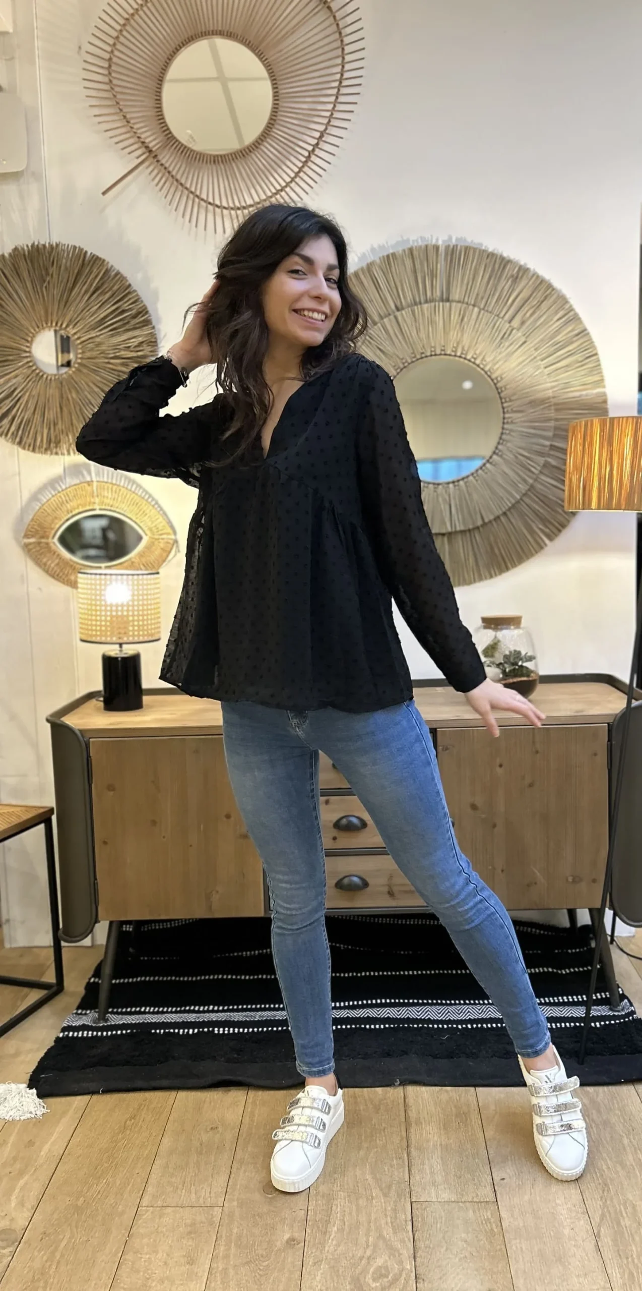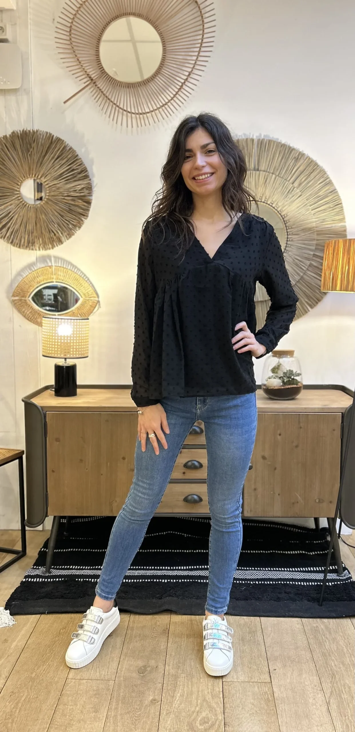 - TOP À ML COL V AVEC POIS PLUMETIS