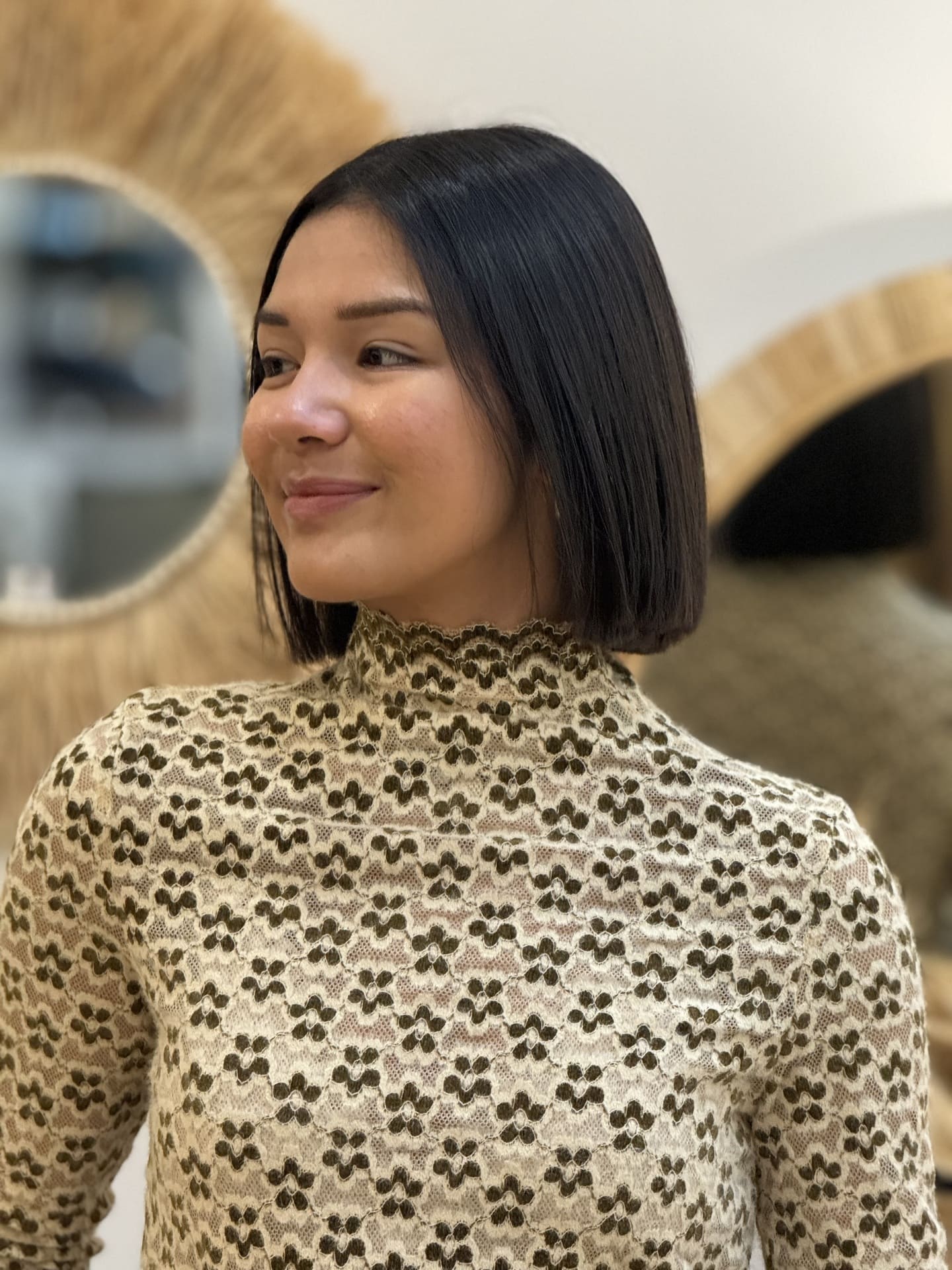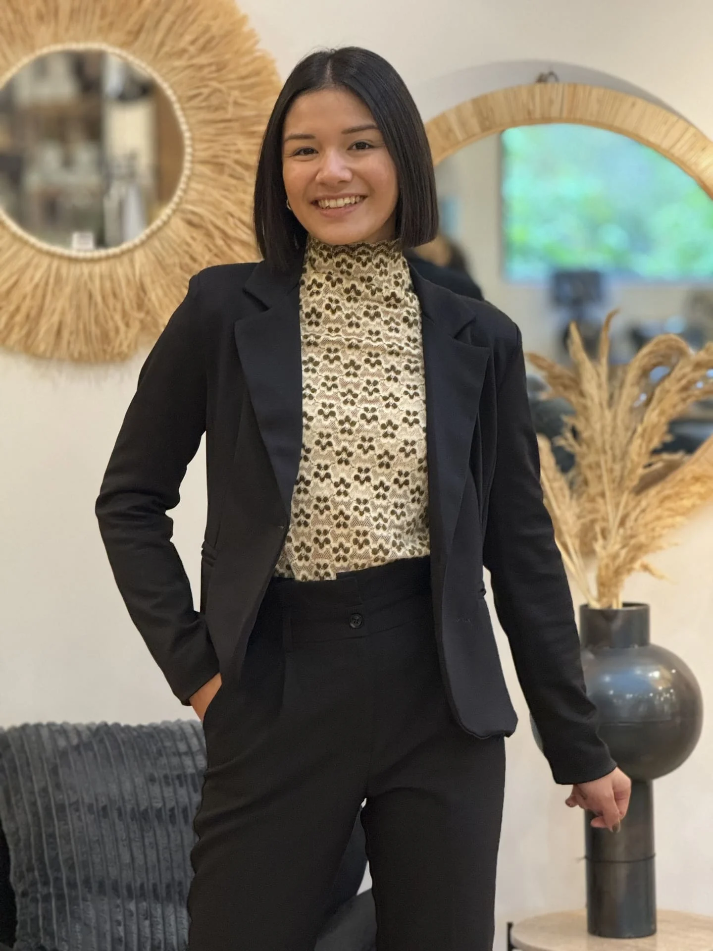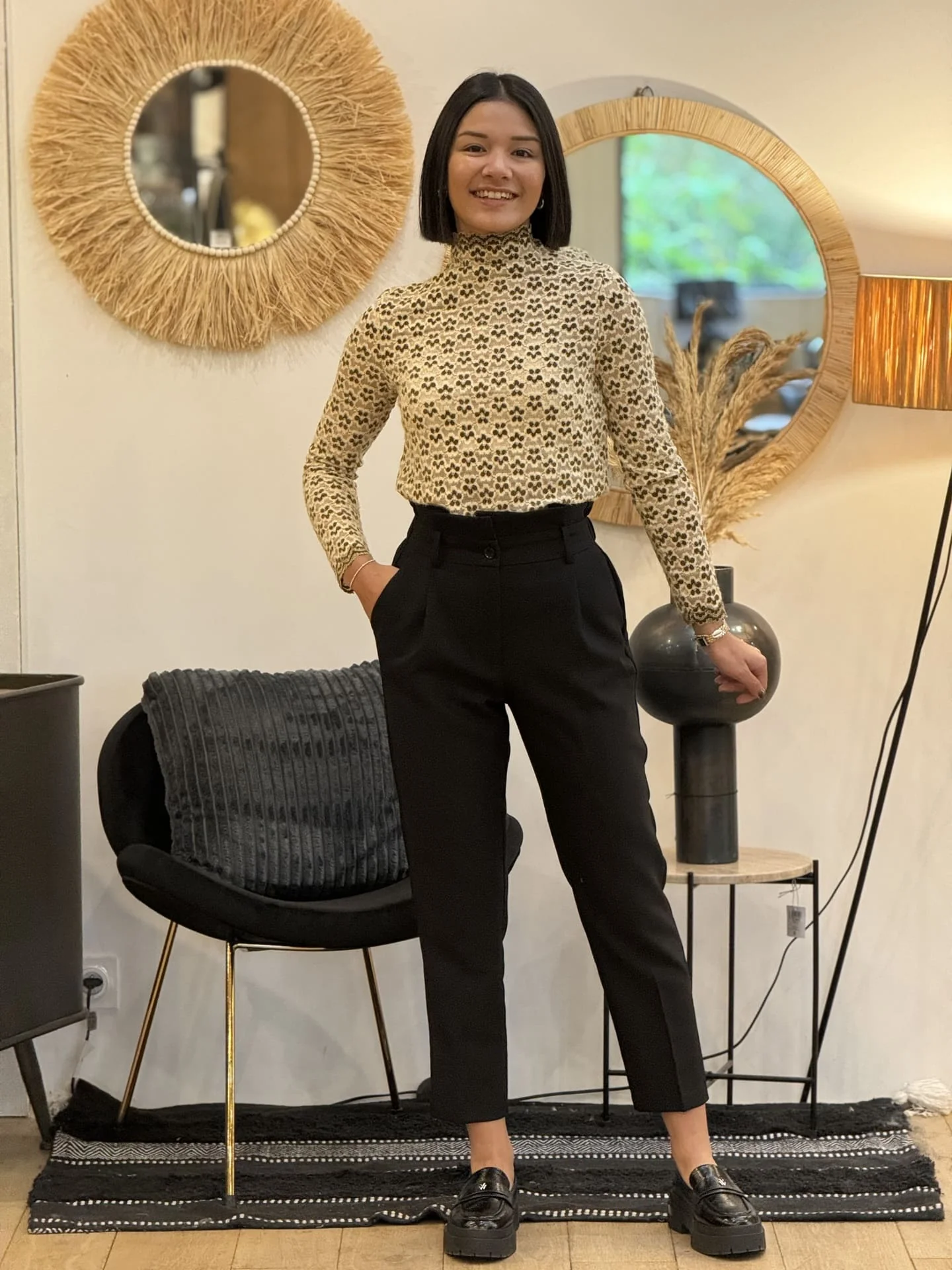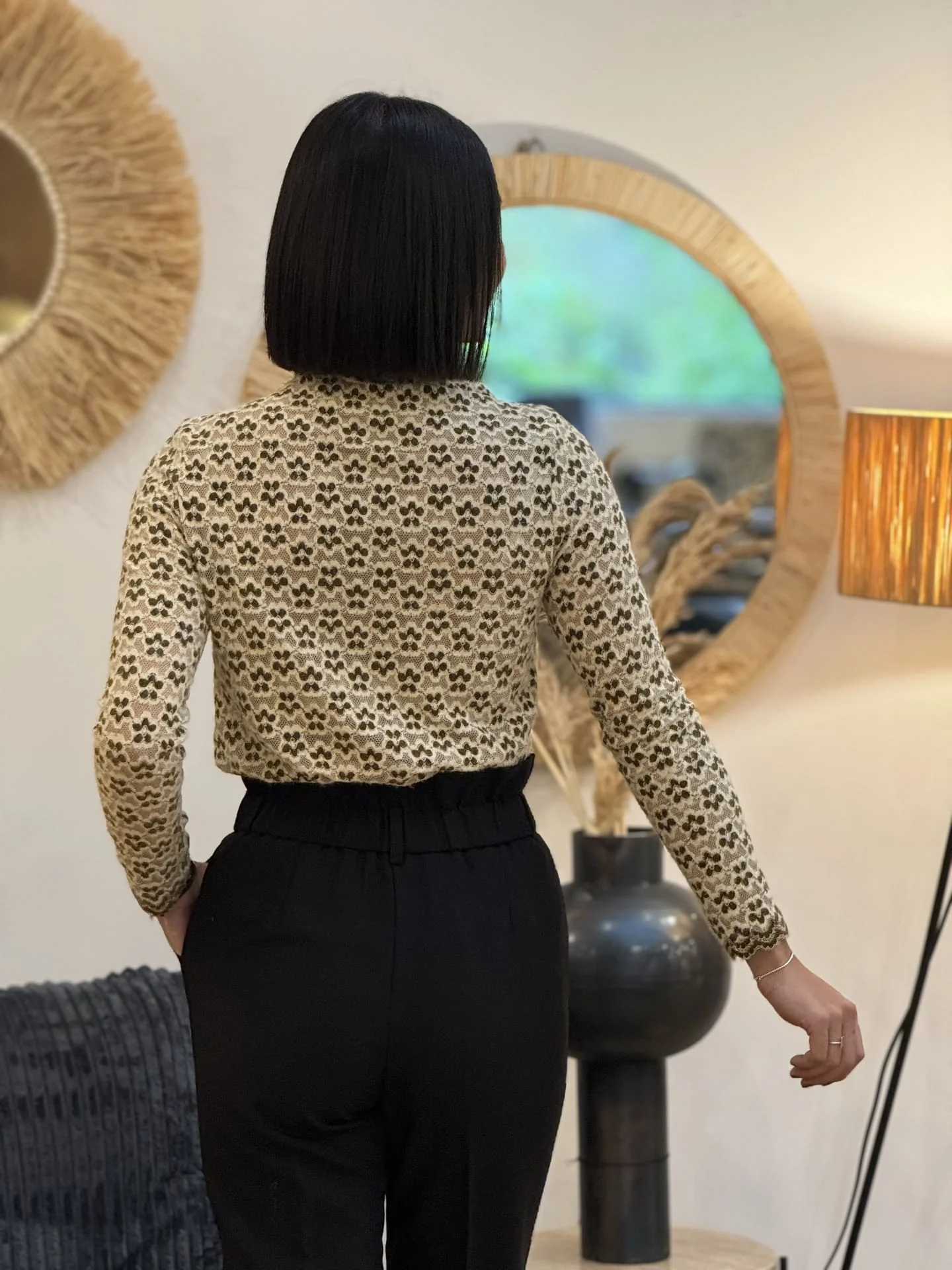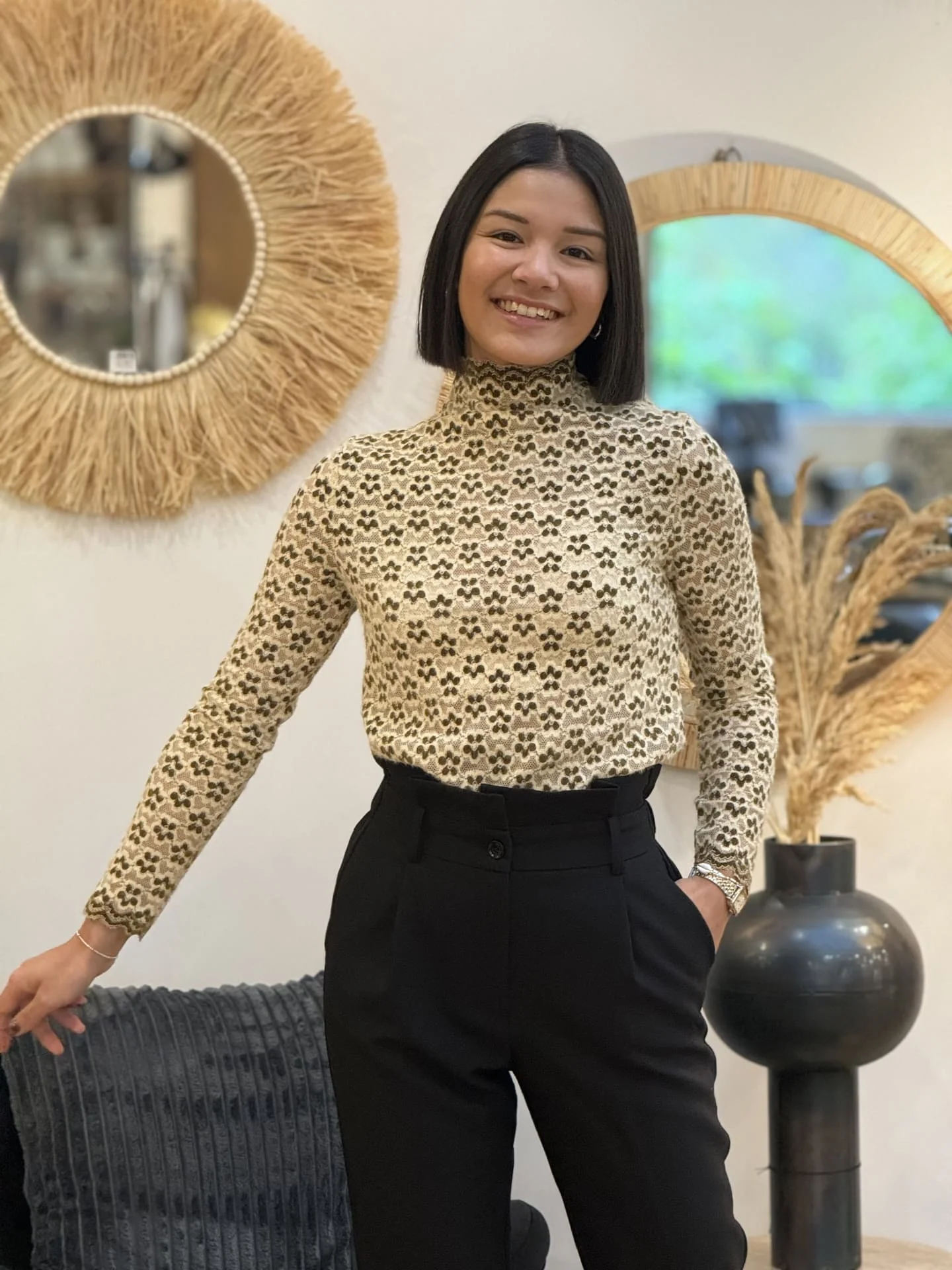 TOP à ml col haut imprimé petites fleurs seventies Mathilde mesure 1m64. Elle portent la taille S. Taille : S (36) / M (38) / L (40) Composition & entretien : 100% POLYESTER Lavage à la main conseillé Besoin d’un conseil ? Consultez notre foire aux questions ou contactez-nous via notre formulaire de contact