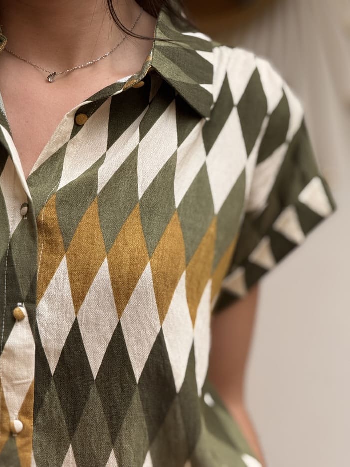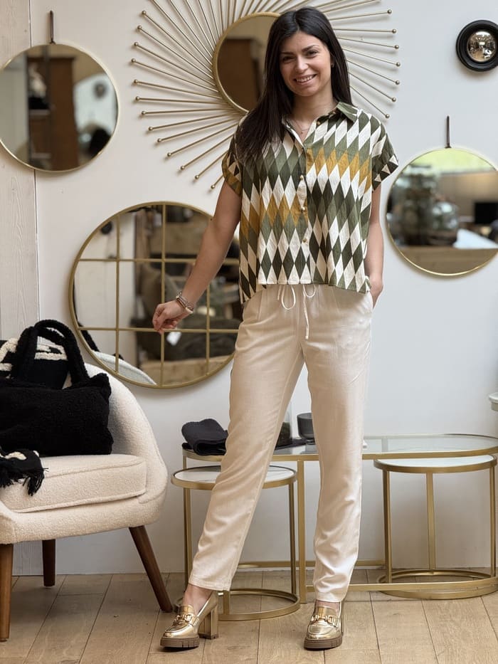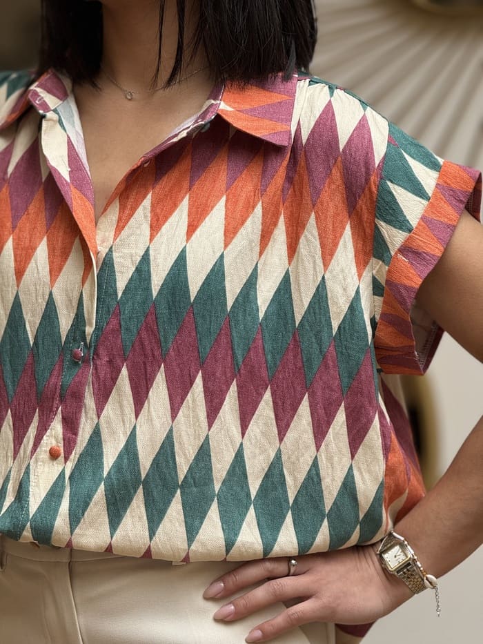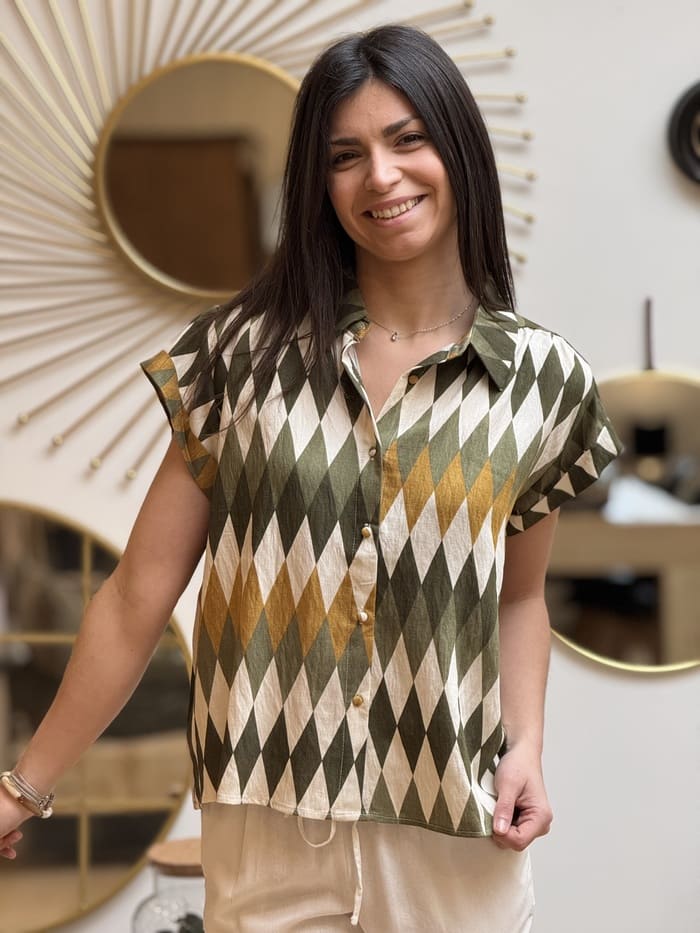 - TOP À MC COL CHEMISE IMPRIMÉ LOSANGE COLORÉ
